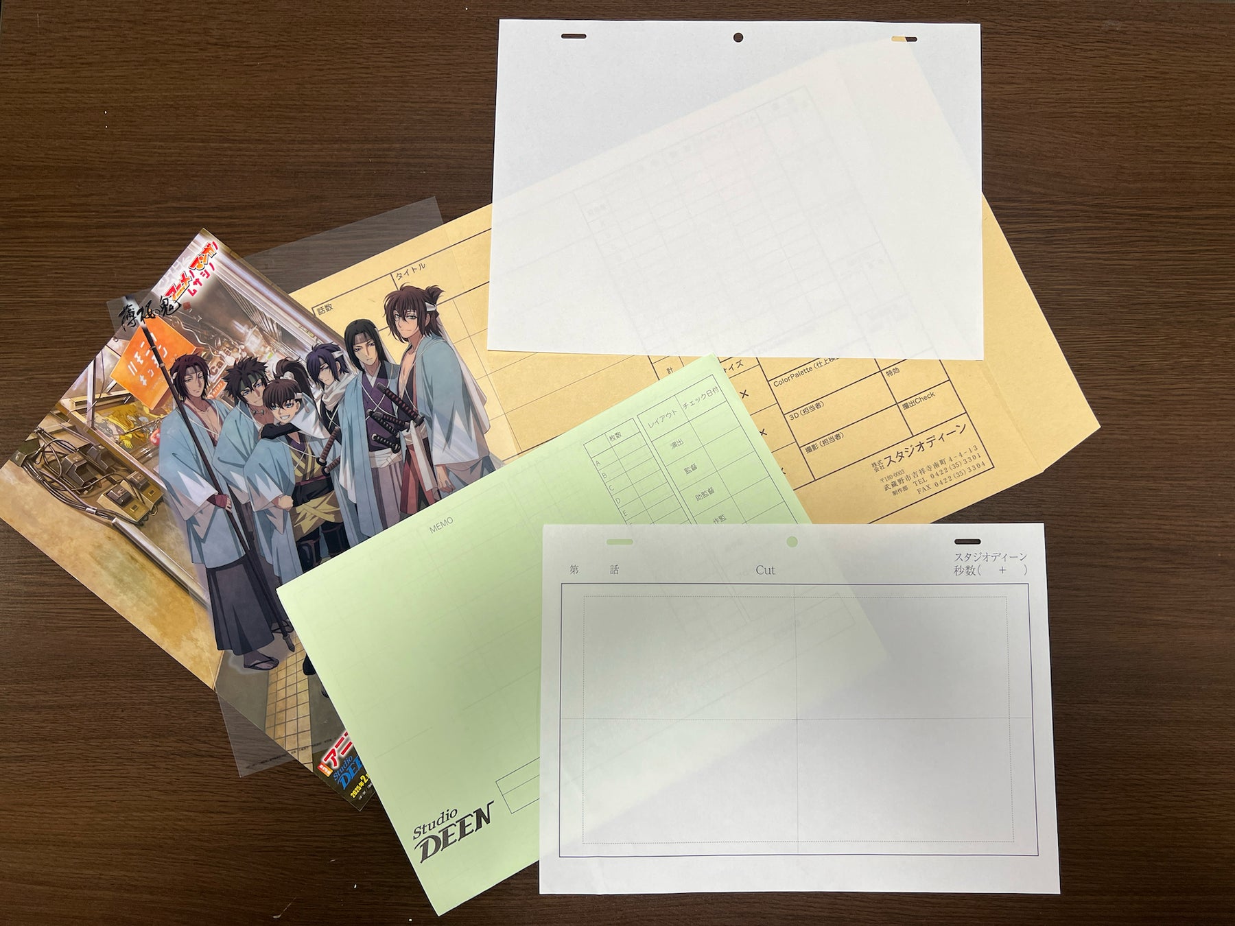 昨年に続きスタジオディーンが実際に使っている「カット袋」「タイムシート」「原画用紙」「レイアウト用紙」を上映会参加者全員にプレゼント。また本年度はTVアニメ『薄桜鬼』コラボキービジュアルのA4クリアポスター&背景台紙(写真左上)も配布します。