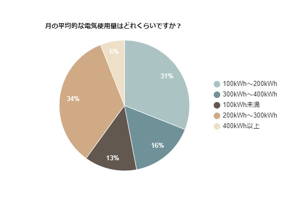 「月の平均的な電気使用量はどれくらいですか?」の質問に多く集まった回答は、「200kWh~300kWh」が34%、「100kWh~200kWh」が31%という結果となっています。