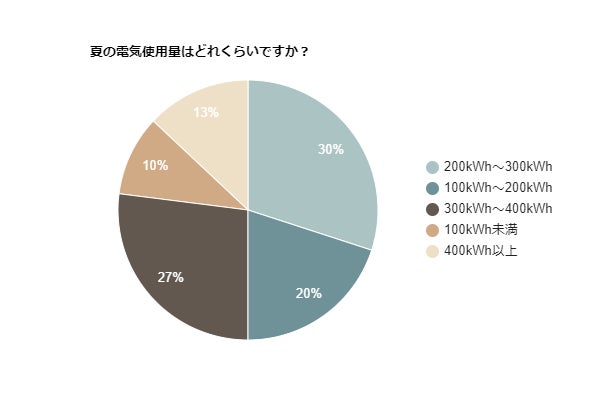 「夏の電気使用量はどれくらいですか?」の質問に、「200kWh~300kWh」が30%、「300kWh~400kWh」が27%、「100kWh~200kWh」が20%と多く回答が集まりました。