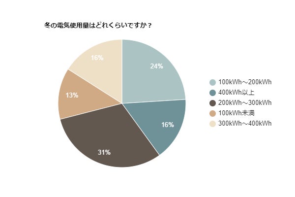 冬の電気使用量はどれくらいか調査をしたところ、「200kWh~300kWh」が31%、「100kWh~200kWh」が24%と多く回答が集まりました。