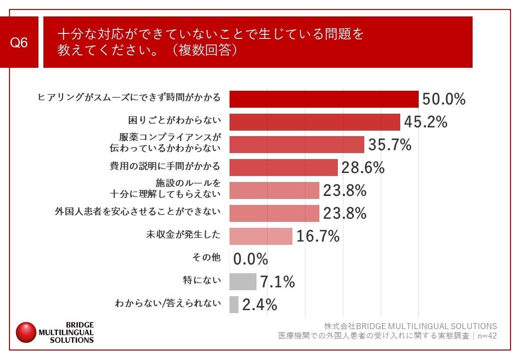 Q5で「あまりできていない」「全くできていない」と回答した方に、「Q6.十分な対応ができていないことで生じている問題を教えてください。(複数回答)」(n=42)と質問したところ、「ヒアリングがスムーズにできず時間がかかる」が50.0%、「困りごとがわからない」が45.2%、「服薬コンプライアンスが伝わっているかわからない」が35.7%という回答となりました。