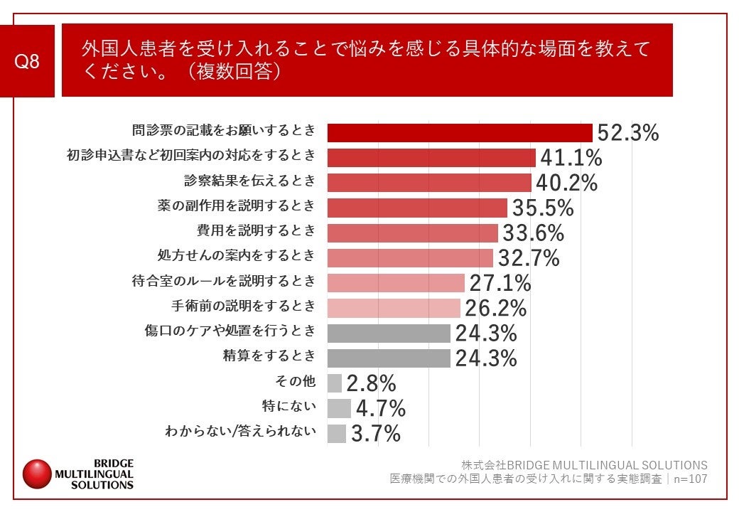 「Q8.外国人患者を受け入れることで悩みを感じる具体的な場面を教えてください。(複数回答)」(n=107)と質問したところ、「問診票の記載をお願いするとき」が52.3%、「初診申込書など初回案内の対応をするとき」が41.1%、「診察結果を伝えるとき」が40.2%という回答となりました。