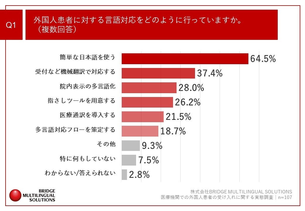 「Q1.外国人患者に対する言語対応をどのように行っていますか。(複数回答)」(n=107)と質問したところ、「簡単な日本語を使う」が64.5%、「受付など機械翻訳で対応する」が37.4%、「院内表示の多言語化」が28.0%という回答となりました。
