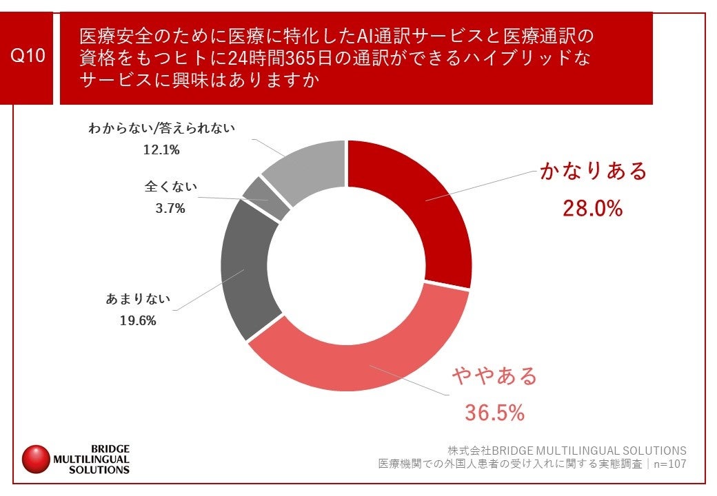 「Q10.医療安全のために医療に特化したAI通訳サービスと医療通訳の資格をもつヒトに24時間365日の通訳ができるハイブリッドなサービスに興味はありますか。」と質問したところ、「ややある」36.4%、「かなりある」が28.0%という回答となりました。