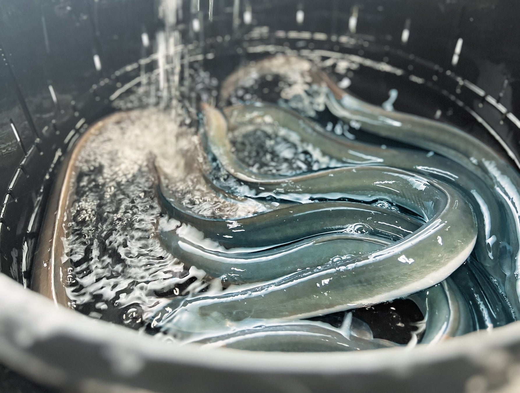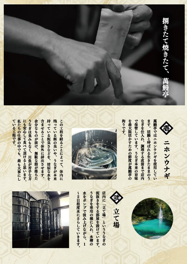 活きた鰻を使う、既に捌かれた鰻を使う、焼いて冷凍した鰻を使う、うなぎ屋さんにもいろいろな形があります。萬鰻亭では『立て場』と呼ばれる鰻を水にさらしておく設備を各店に設置。活きた鰻を仕入れ1~2日『立てる』ことにより、餌の残りや泥など余分なものを吐き出し、鰻のカラダがきれいになり臭みも無くなります。立て場があることはうなぎ屋さんでも非常に珍しいです。