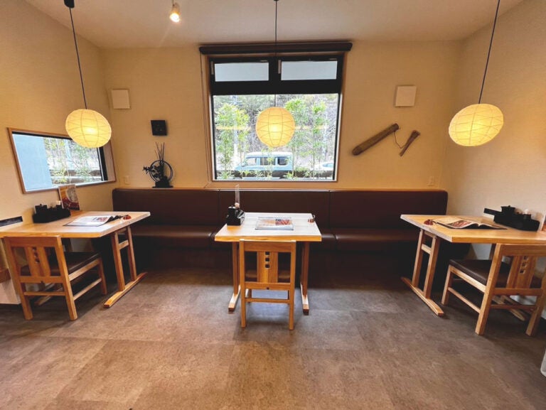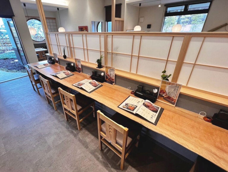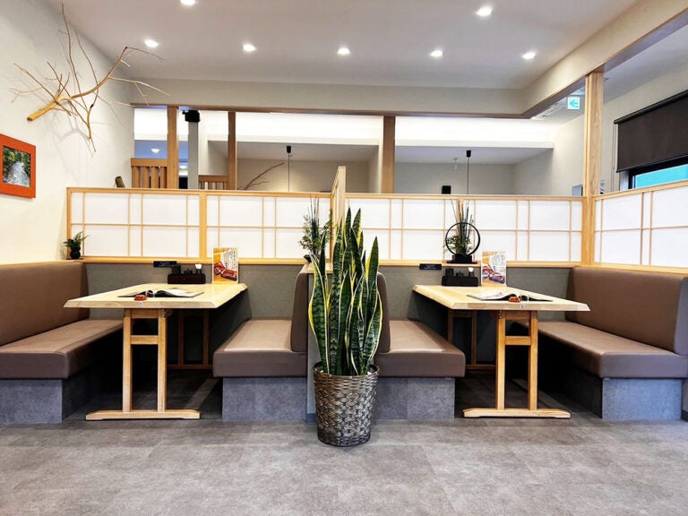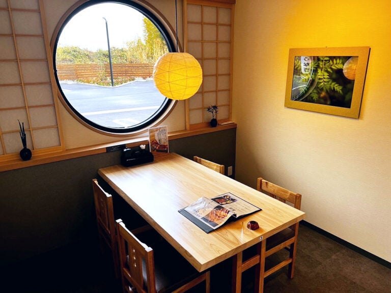 店内は白を基調とし、暖か味のある色合いで統一された和の雰囲気です。ゆったりと座って頂けるように席と席の間隔も広くとっており、バリアフリーの設計で車イスやベビーカーでもそのままお席について頂けます。テーブル席とカウンター席でご用意しておりますのでわざわざ靴を脱いで頂くこともありません。