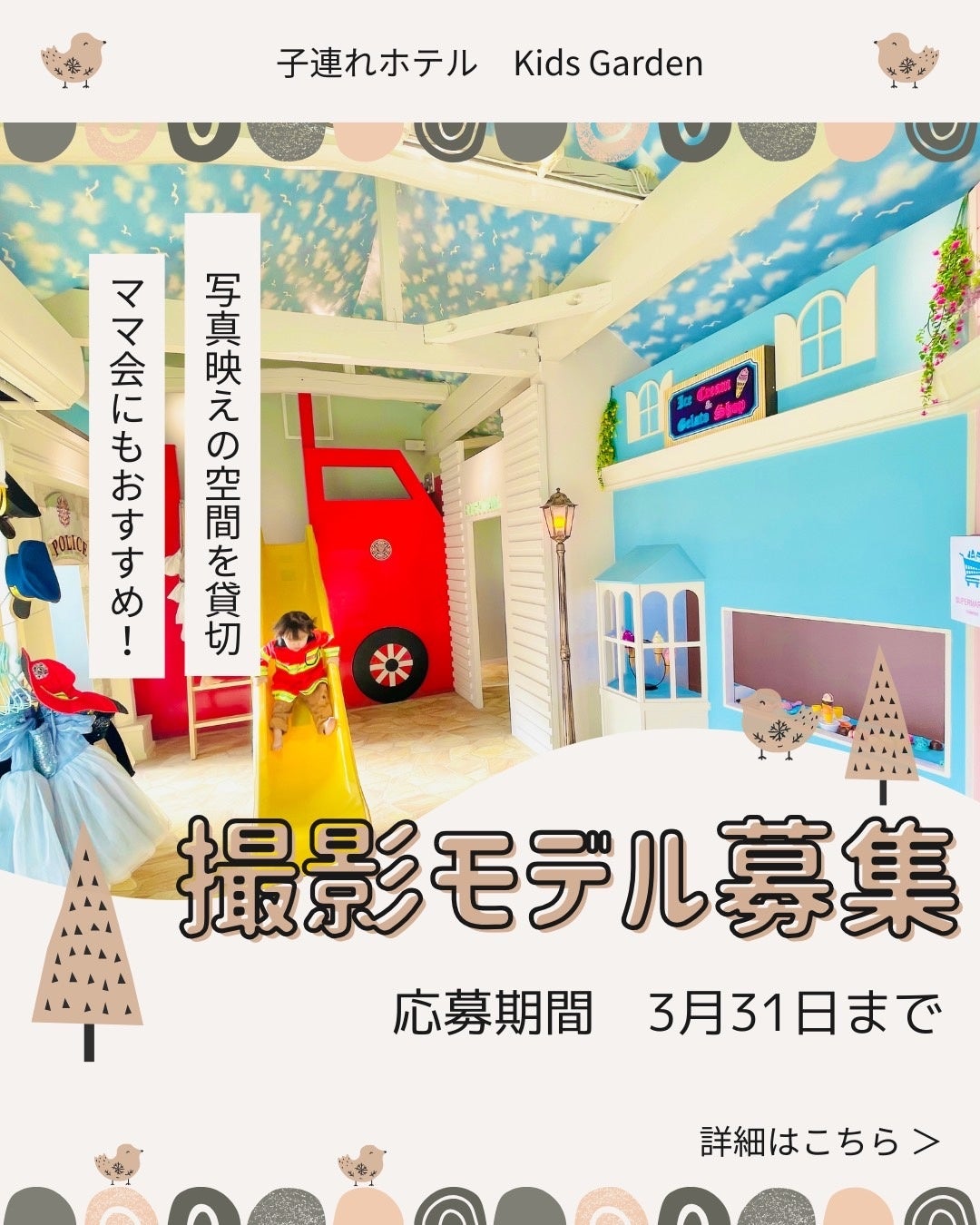 昨年末、千葉県松戸市にOpenした子連れホテル Kids Gardenにて撮影モデルを募集。モデルデビューができるほか、応募者全員プレゼント付きの見逃せない企画がスタート!