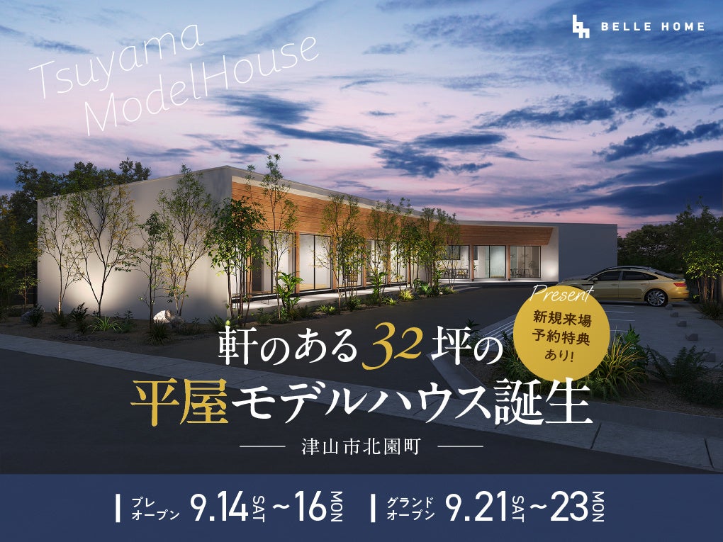 このたび、ベル・ホームの、デザイン性と快適・健康・省エネへのこだわりが体感できるモデルハウスを、2024年9月21日(土)より津山市にグランドオープンいたします。グランドオープンに先立ち、9月14日(土)~16日(月・祝)プレオープンイベントを開催します。津山市のベル・ホームモデルハウスは初となります。