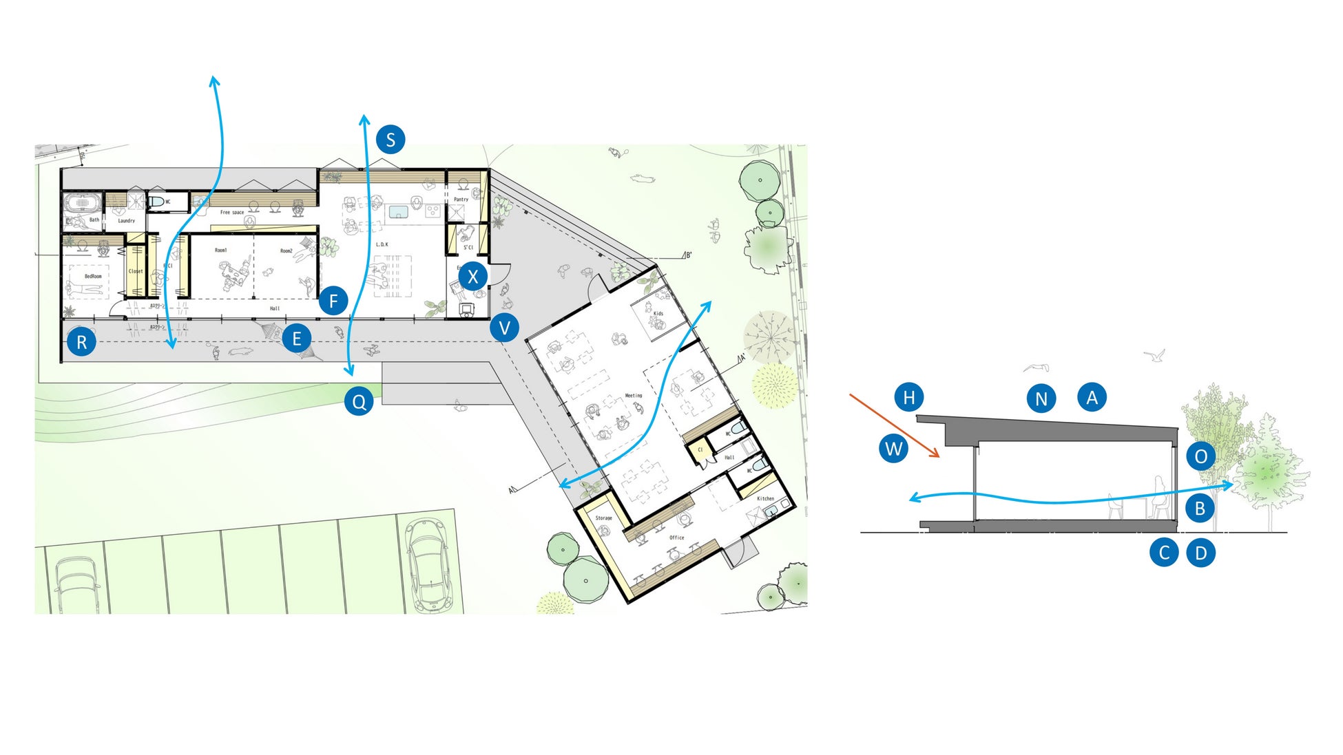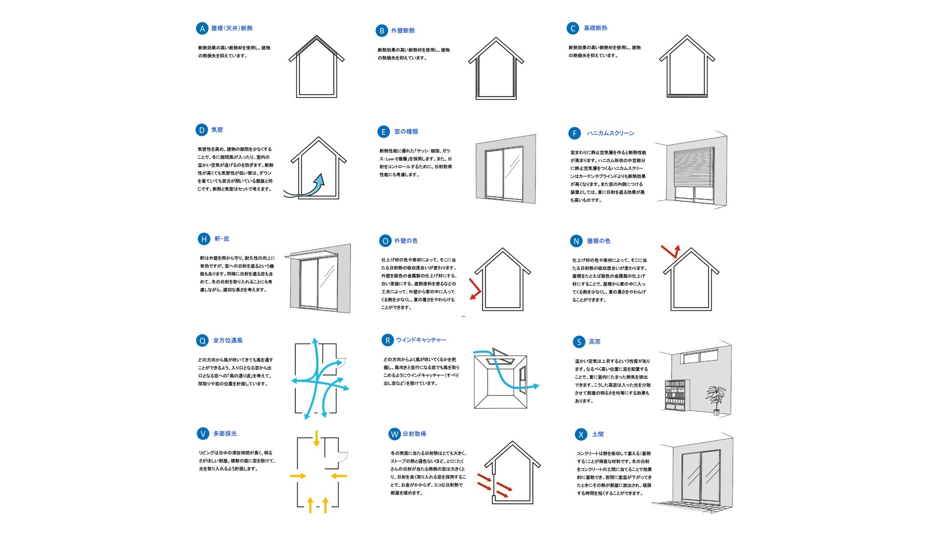 また、快適で省エネで健康を目指したモデルハウスにするために、自然の力も活用しながらモデルハウス内いろんな場所で、パッシブデザインを取り入れています。パッシブデザインは、自然エネルギーを最大限に活用しながら、快適な住環境を構築するための設計手法で、断熱・日射遮蔽・自然風利用・昼光利用・日射熱利用暖房のくふうも施しています。