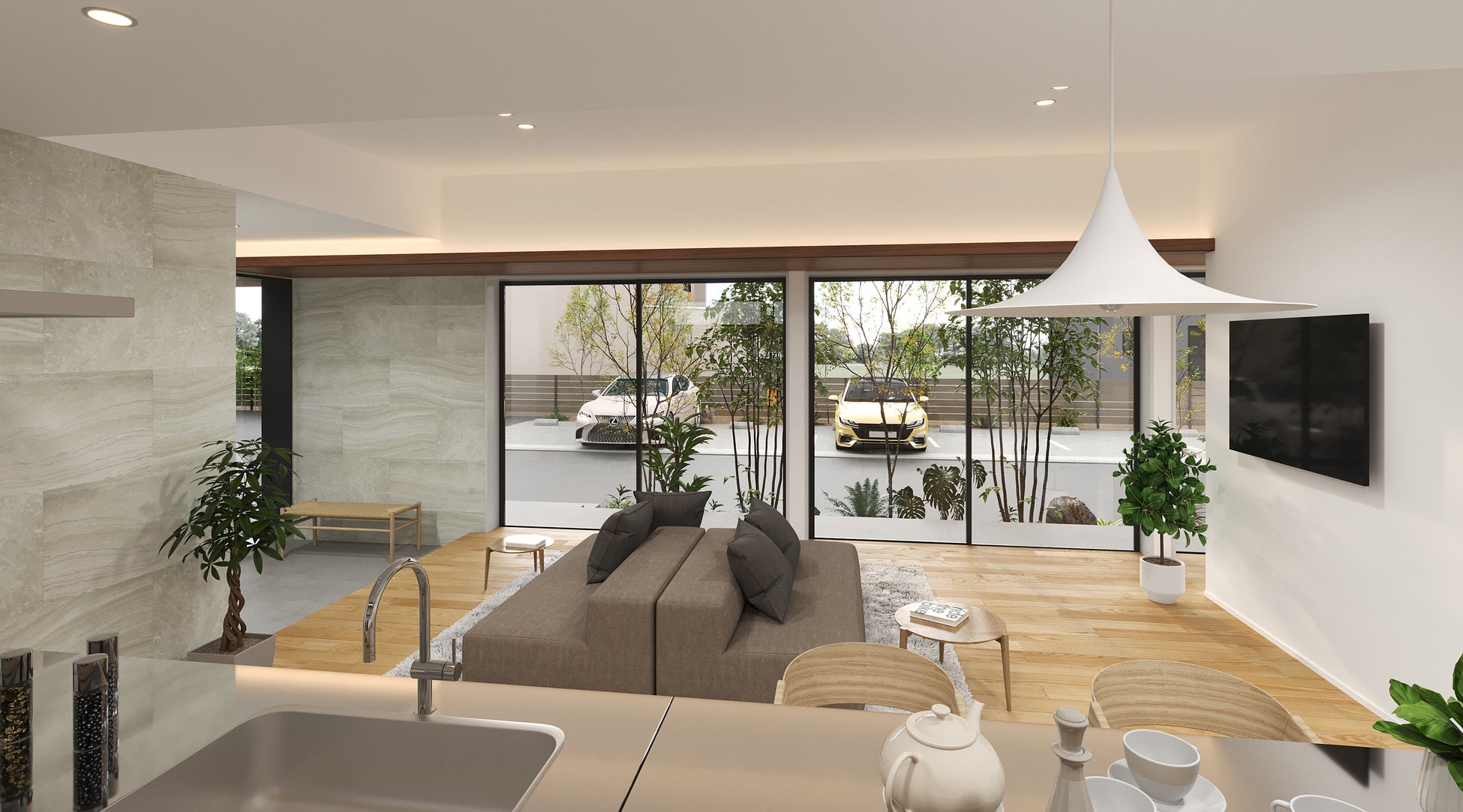 ご家族ひとりひとりがそれぞれのスタイルでくつろいでいただけるLDK空間、自然の中に身を置いたようなインテリアイメージに加えて、もちろん料理道具や日用品をしまえる大容量のパントリーも完備。家事ラク動線の回遊動線や、可変性のある子供部屋で、末永くおうち時間をより楽しんで過ごしていただける仕掛けを設けております。