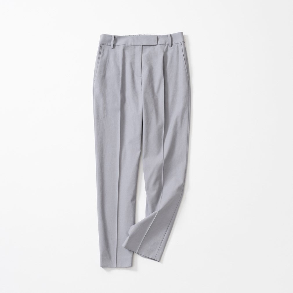 今年の「リネンブレンドシリーズ」には、テーパードパンツが仲間入り。腰部分にワンタックを入れて腰、太もも、ヒップにてゆとりを持たせているため、 スティックパンツだと下半身のラインが気になる...という方にもはきやすいシルエットです。タックとセンタープレスを直線的に繋ぐことで、立体的で縦に長いラインをつくっています。