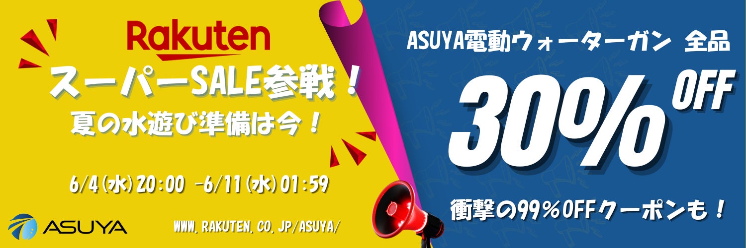 ASUYA電動ウォーターガン、楽天スーパーSALEに参戦!全製品30%OFFに加え、衝撃の99%OFFクーポンも登場!