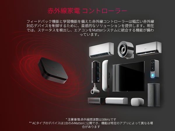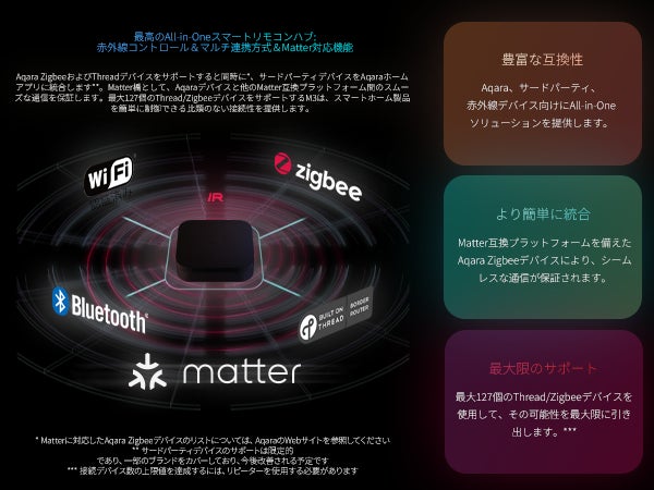 Thread、Zigbee、Wi-Fi、Bluetooth、赤外線(IR)などの複数通信方式に対応できるスマートリモコンM3ハブは、最大で127台のAqara製品、赤外線デバイス、サードパーティMatterデバイスを統合し、Aqara Homeアプリ経由で管理できます。