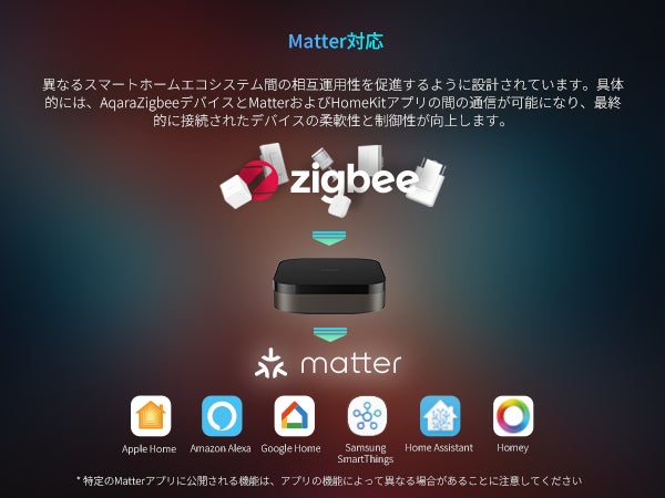 従来のAqaraハブ製品と同様に、M3ハブはAqaraのzigbeeデバイスを管理したり、Matterブリッジ機能でMatter非対応zigbeeデバイスをMatterに対応させたりすることができます。その他、Aqara最新のThreadデバイスをM3ハブに登録し、従来のzigbeeデバイスと連携させることも可能になります。