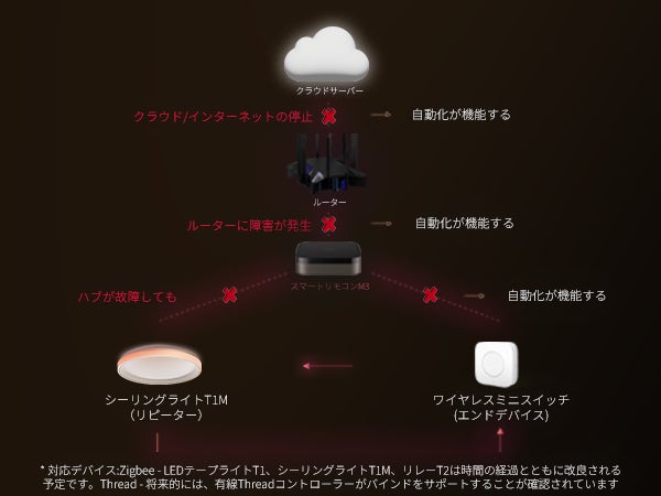 *現時点、一部のAqara Zigbeeデバイス(シーリングライトT1M、LEDテープライトT1)がこの機能に対応しており、M3ハブの故障時でも自動化を実行できます。