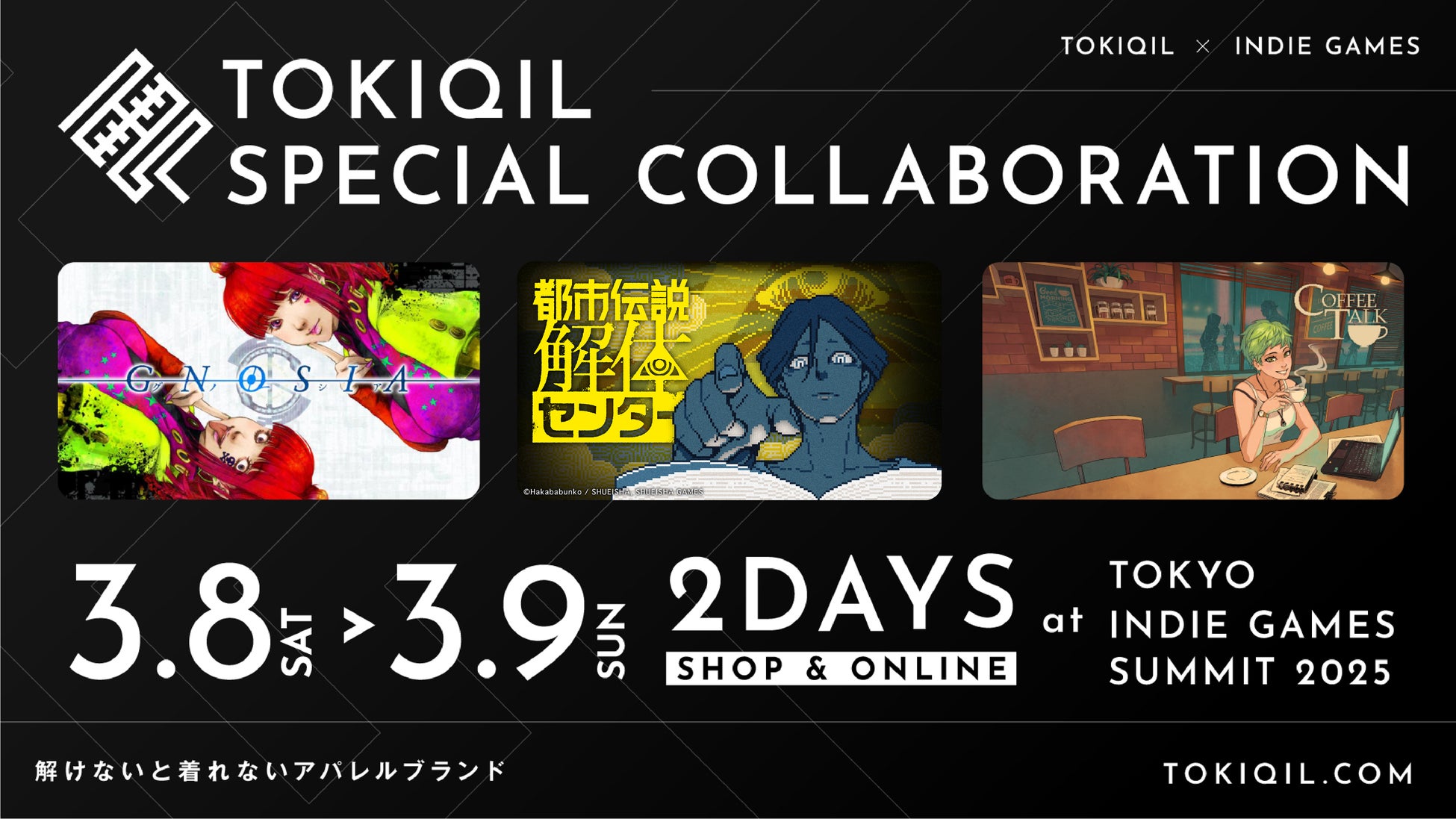 解けないと買えない不思議なアパレルブランド「トキキル」は、 TOKYO INDIE GAMES SUMMIT 2025 in 吉祥寺PARCOを記念し話題のインディゲームとのコラボ服を制作・販売します