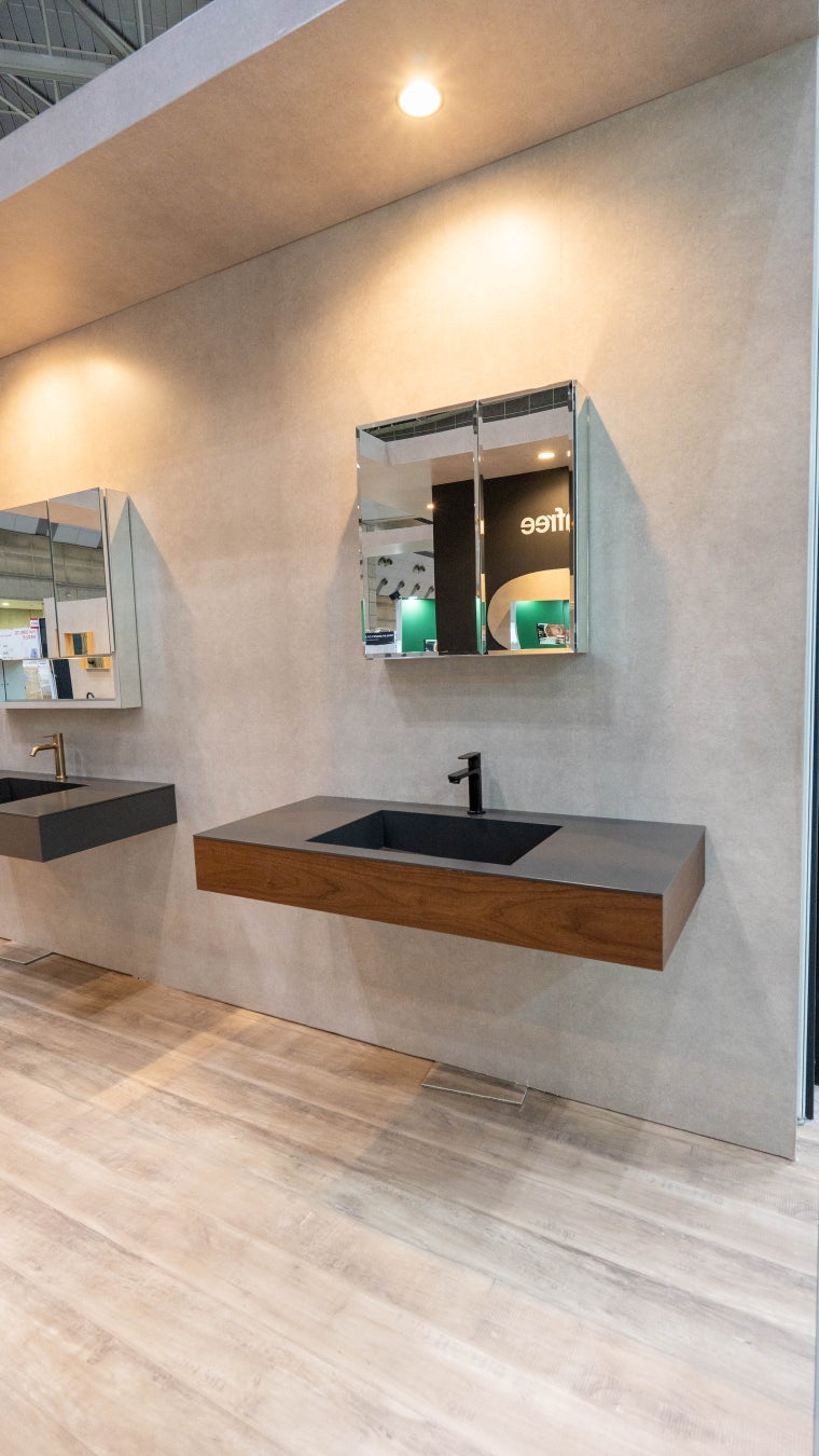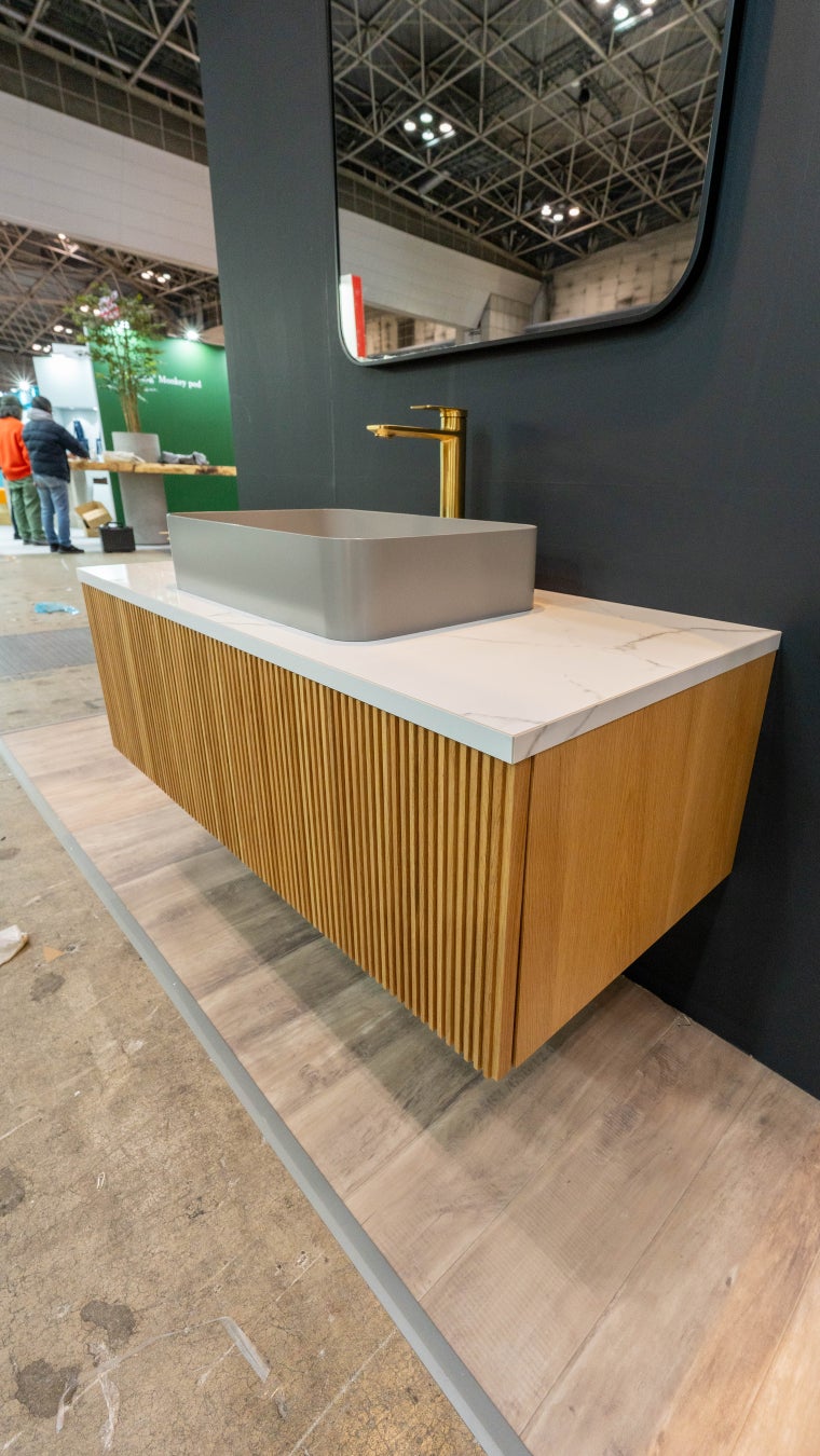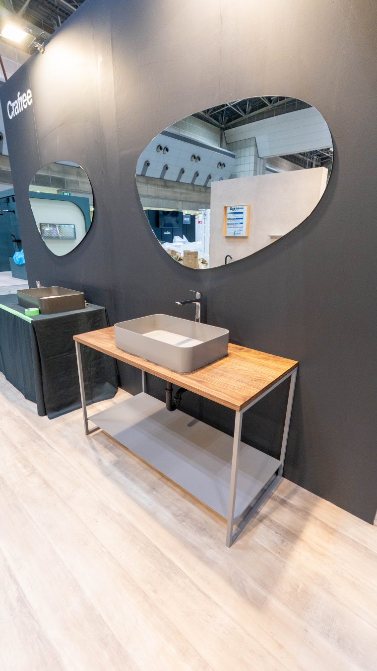 今回の展示では、iFデザイン賞2025を受賞した洗面ボウルNuar(ヌアール)や洗面台シリーズに加え、4月以降発売予定の新製品も展示させていただきました。
