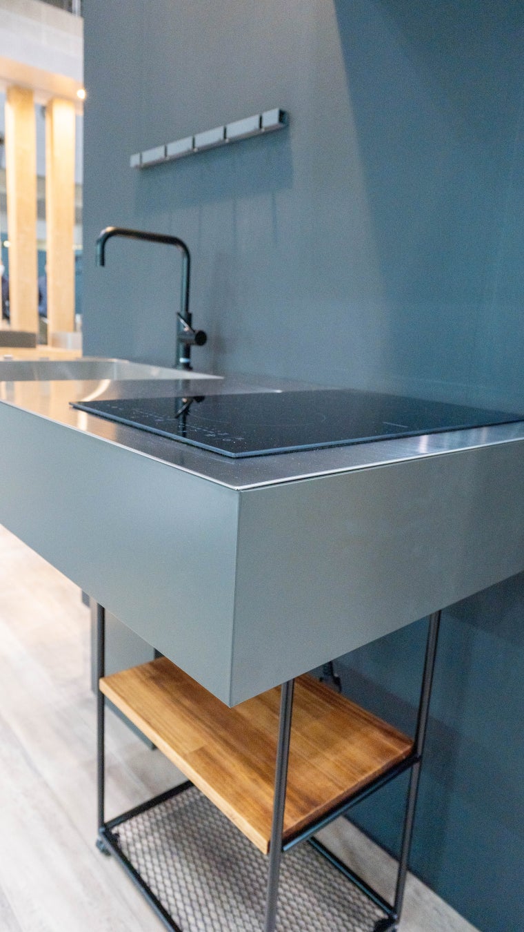 極限まで要素を減らしたミニマルデザインのコンパクトキッチンです。極薄の見付けのステンレスカウンターは、すっきりとしたシームレスデザインを実現しました。