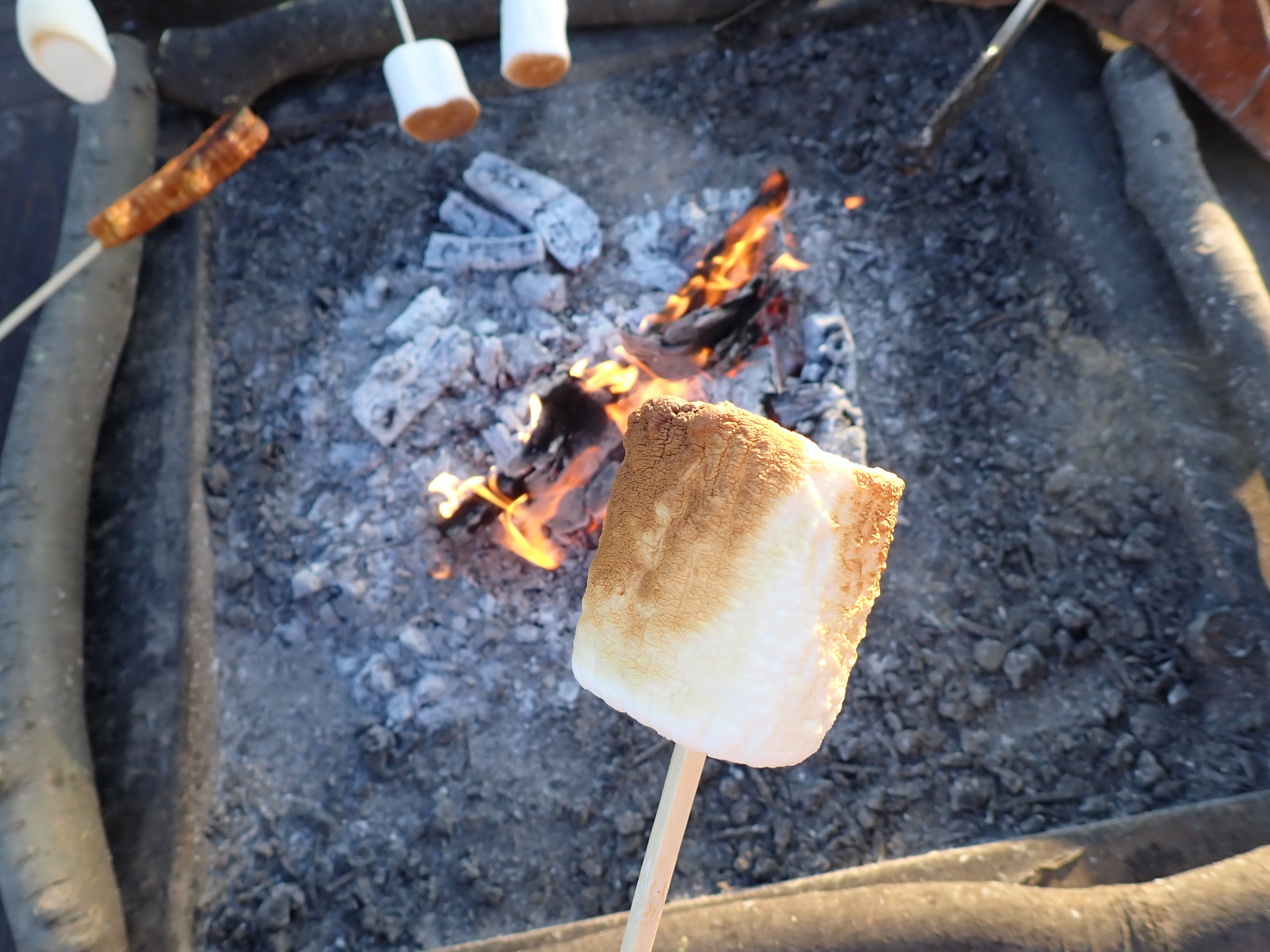 スタッフが火を管理する焚き火テーブルで、CAFEで購入した串メニューを炙って楽しむ手軽な体験型プラン。着火や火の管理は不要で、“楽しい部分だけ”を体験できます。