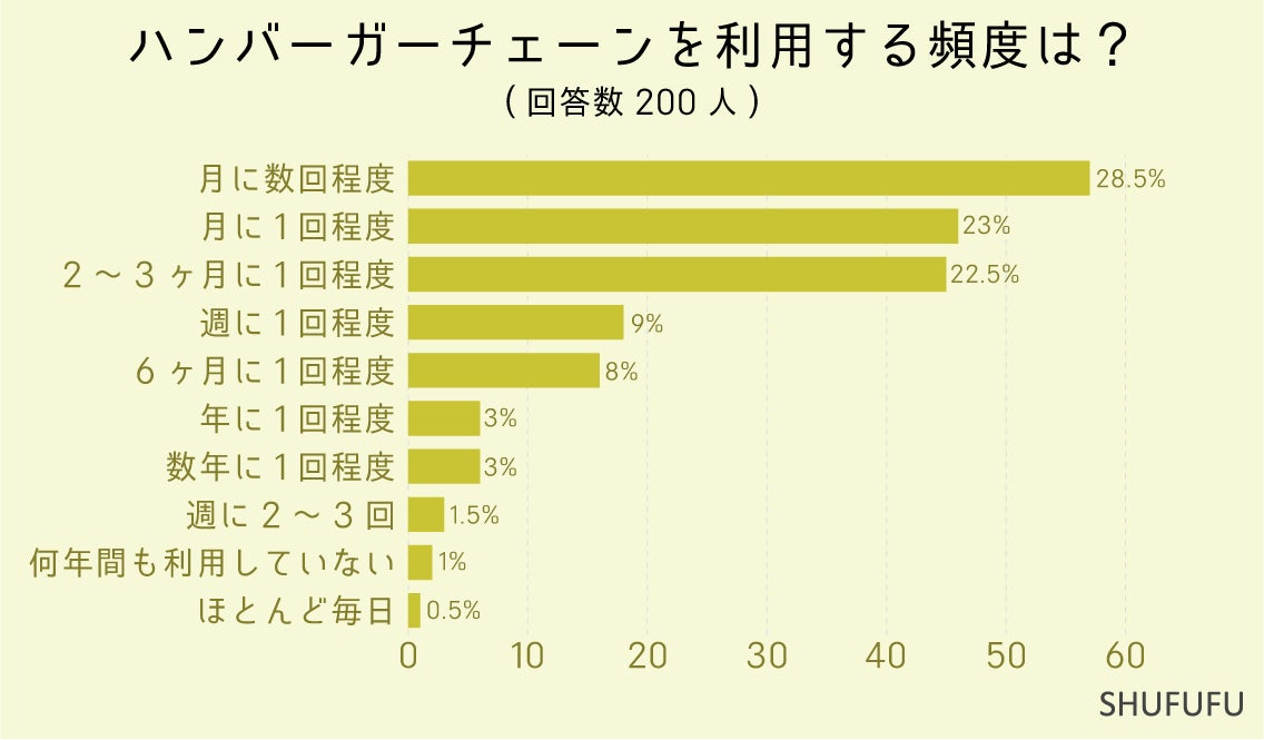 200人にハンバーガーチェーンに関するアンケート調査を行った所、利用頻度に関しては「月に数回程度」と回答する人が最も多かったです。