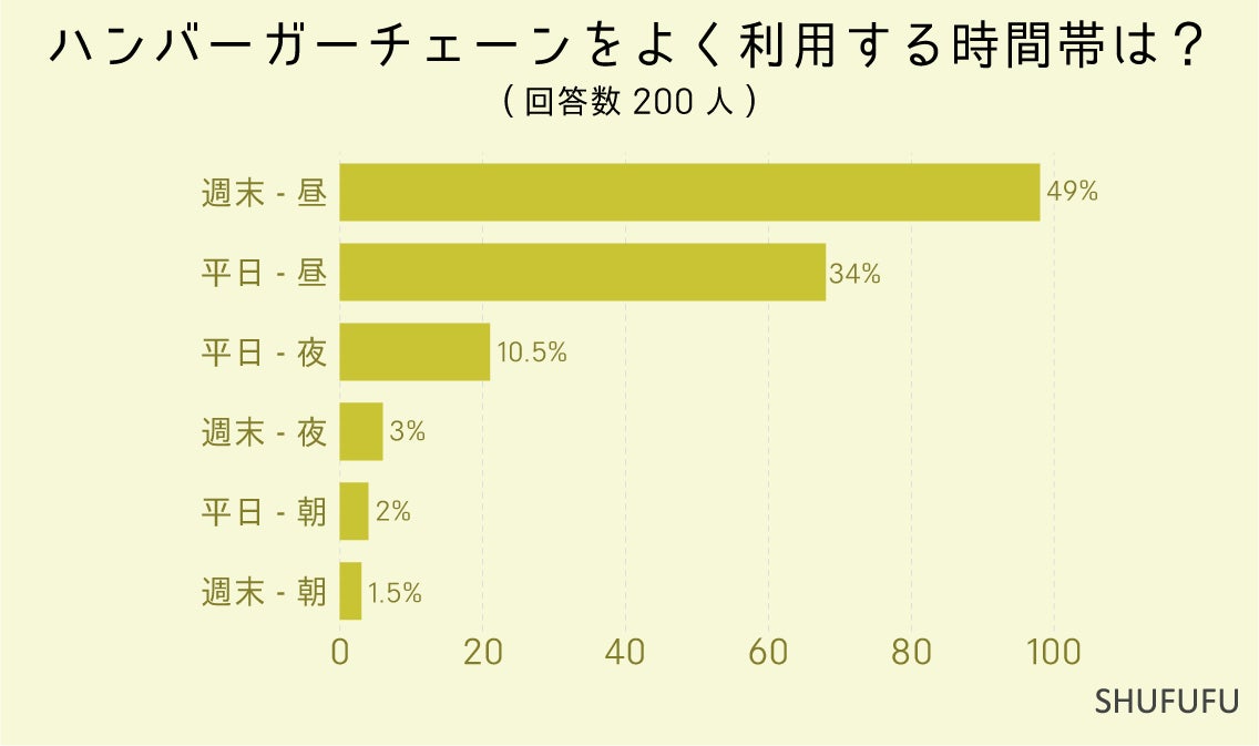 ハンバーガーチェーンをよく利用する時間帯に関しては1位「週末-昼(49%)」、2位「平日-昼(34%)」でした。
