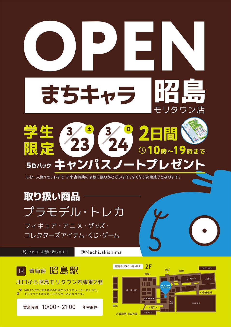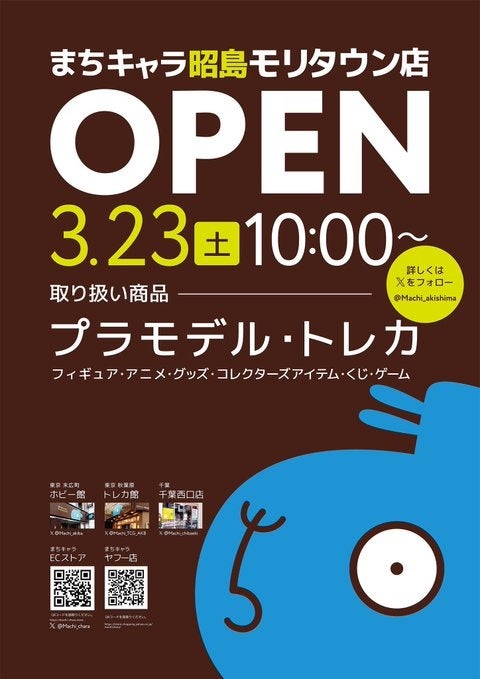 マッチングワールド株式会社(東京都・中央区)が運営するゲーム・ホビーショップ「まちキャラ」。3月23日(土)に東京都・昭島市のショッピングセンター「モリタウン」に新店をオープンいたします。