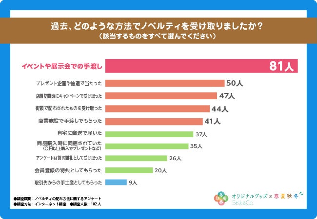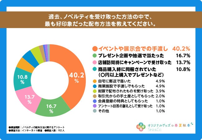 そこで今回、オリジナルグッズの春夏秋冬(株式会社秋冬春夏https://www.s-t-s-k.com/)は、ノベルティを受け取ったことがある全国20〜60代の男女102名を対象に「ノベルティの配布方法」に関する調査を実施しました。