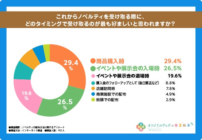 一方、最も悪い印象を与えた配布方法は「街頭で配布されたものを受け取った」(25.5%)でした。また、今後ノベルティを受け取る際に好ましいタイミングとしては「商品購入時」(29.4%)や「イベントや展示会の入場時」(26.5%)が挙げられ、商品購入時やイベントの一部としての『お得感』を得られることが評価されているようです。