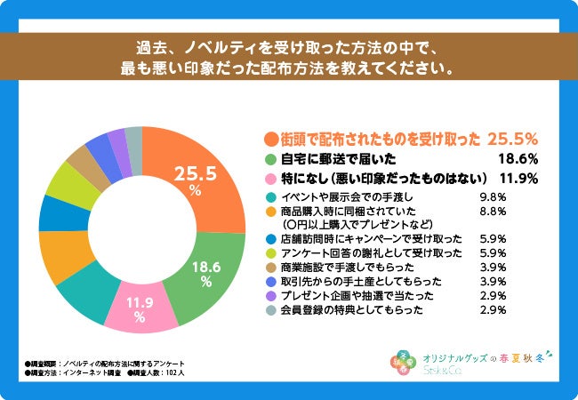 次に「過去、ノベルティを受け取った方法の中で、最も悪い印象だった配布方法を教えてください。」と質問したところ、最も悪い印象を与えたノベルティの配布方法は「街頭で配布されたものを受け取った」で、全体の25.5%がこの方法に不快感を抱いていることがわかりました。押しつけがましく思われたり、受け取る側が選べないため、状況によっては煩しく思われたりする可能性が高くなります。