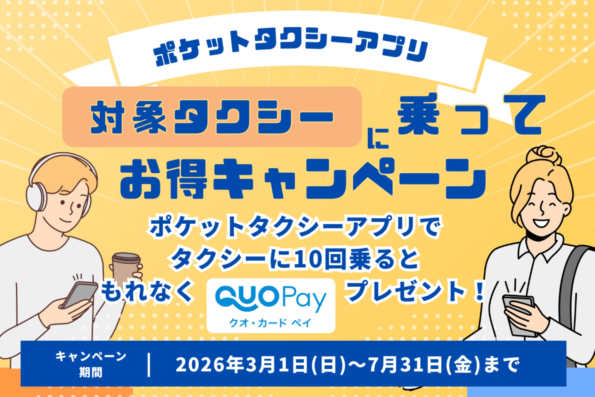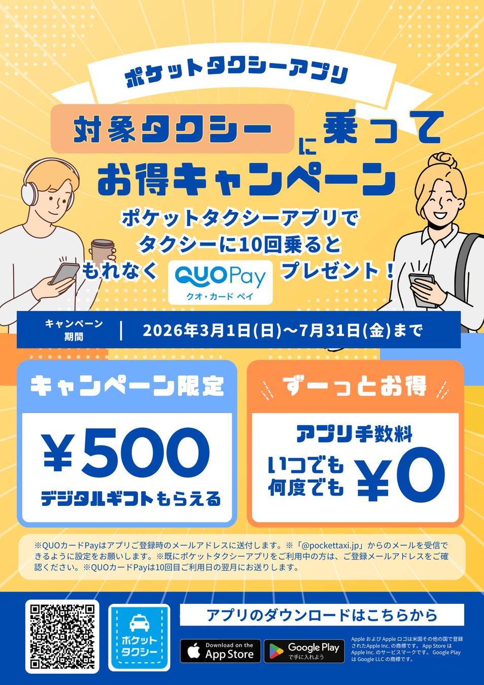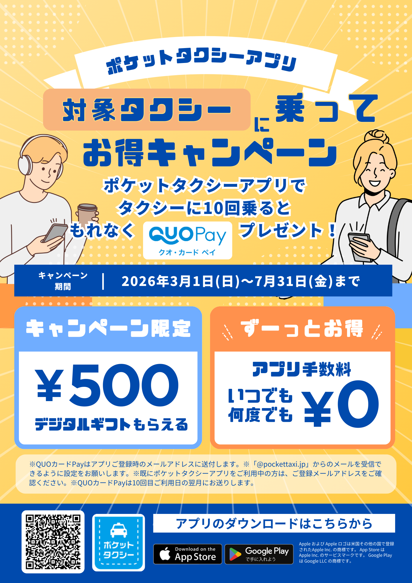◇ポケットタクシーアプリを使ったタクシー乗車10回ごとにQUOカードPay500円分をプレゼント。