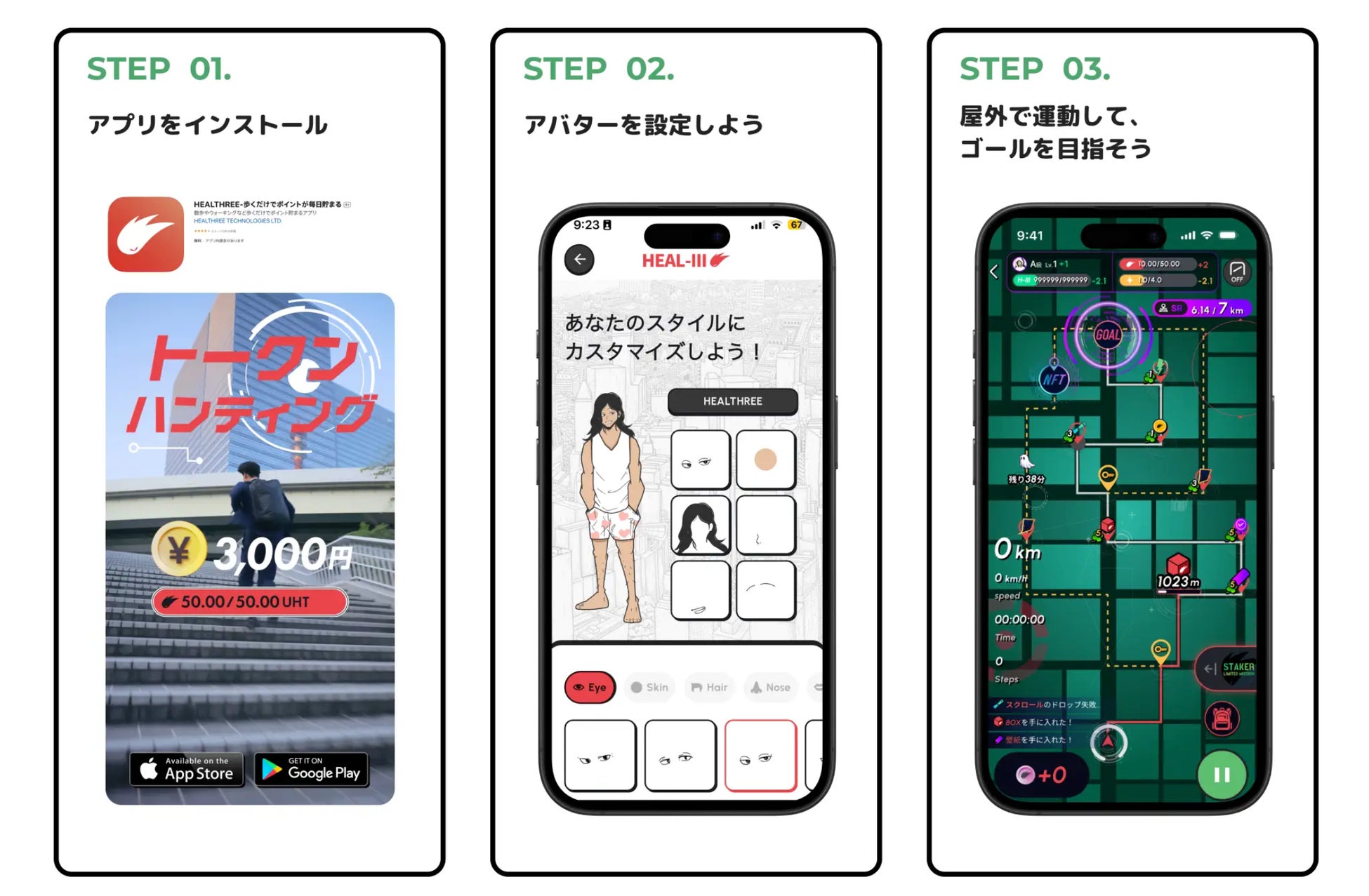 「HEALTHREE」は、ゲーミフィケーションと独自の報酬システムを組み合わせた新感覚のヘルスケアゲームです。ゲーム感覚で運動習慣が身につくだけでなく、初期課金や難しい設定も一切なく、運動距離に応じて暗号資産がどんどん稼げる新しい体験を提供しています。