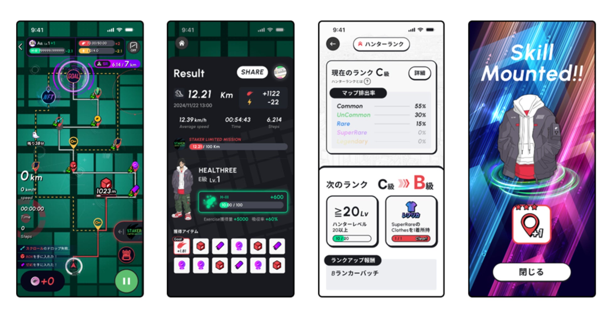 運動距離に応じて「H-Ⅲ(ゲーム内の経験値)」が獲得できます。H-Ⅲが貯まるとユーザーがレベルアップし、レベルに応じてランクを上げることができます。また、ランクに応じてマップクリア時の報酬も増加します。マップのゴールに到達すれば追加報酬が得られるため、達成感を感じながら運動習慣を育むことができます。