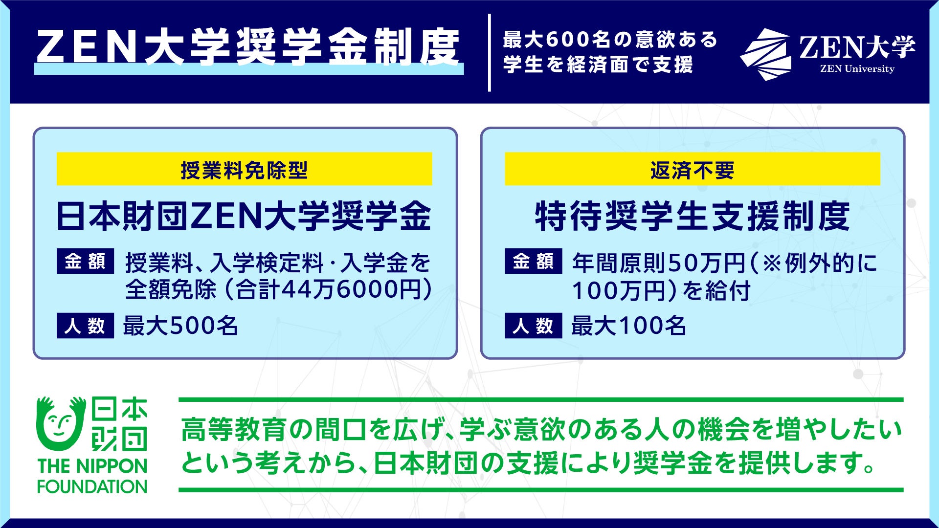 ZEN大学では高等教育の間口を広げ、学ぶ意欲のある方々の機会を増やしたいという考えから、日本財団の支援による2種類の奨学金制度を用意し、本日2024年11月12日より募集を開始します。