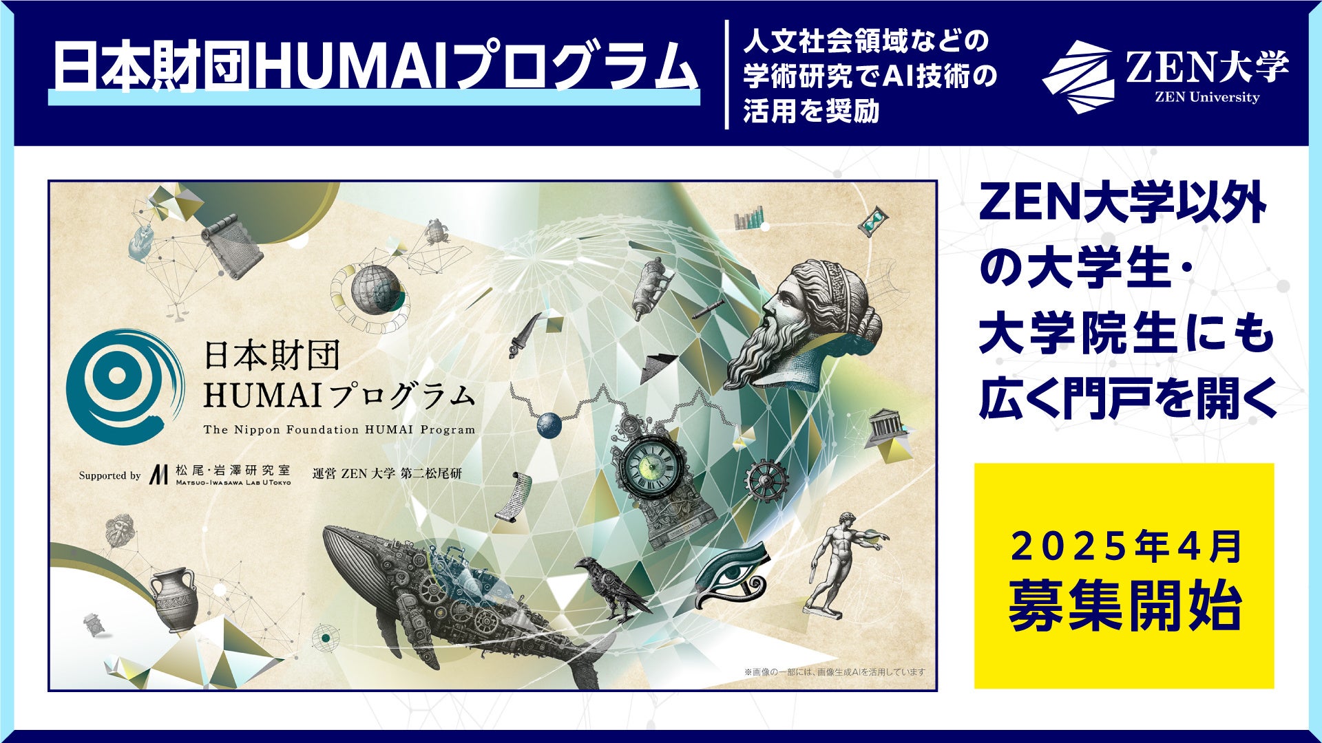 東京大学松尾・岩澤研究室の協力のもと、第二松尾研が運営するAI活用奨励制度「日本財団HUMAI(*2)プログラム」を創設します。人文社会領域を中心に様々な関心をもつAI初学者の大学生・大学院生を主な対象とし、学術研究活動において新しいAI技術を積極的に活用できるように援助します。具体的には日本財団からの支援に基づく「AI活用奨励金」およびAIを用いた「研究奨励金」を支給するほか、コミュニティ内での定期的なアウトプットを義務づけることで、ほかの学生と知見を共有しあい学術研究を深められるようにしていきます。なお、対象となる学生の所属は問わず、ZEN大学の学生以外にも広く門戸を開きます。参加者の募集は2025年4月に開始予定です。