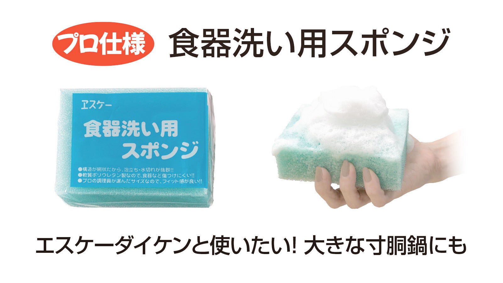 「エスケーダイケン」と組み合わせて使いたい人気のスポンジ。泡立ちがよく、寸胴鍋など大きな調理器具も洗いやすい大サイズ。水切れよく清潔。耐久性に優れ長持ちします。そのままでも、小さくカットしてもお使いいただけます。