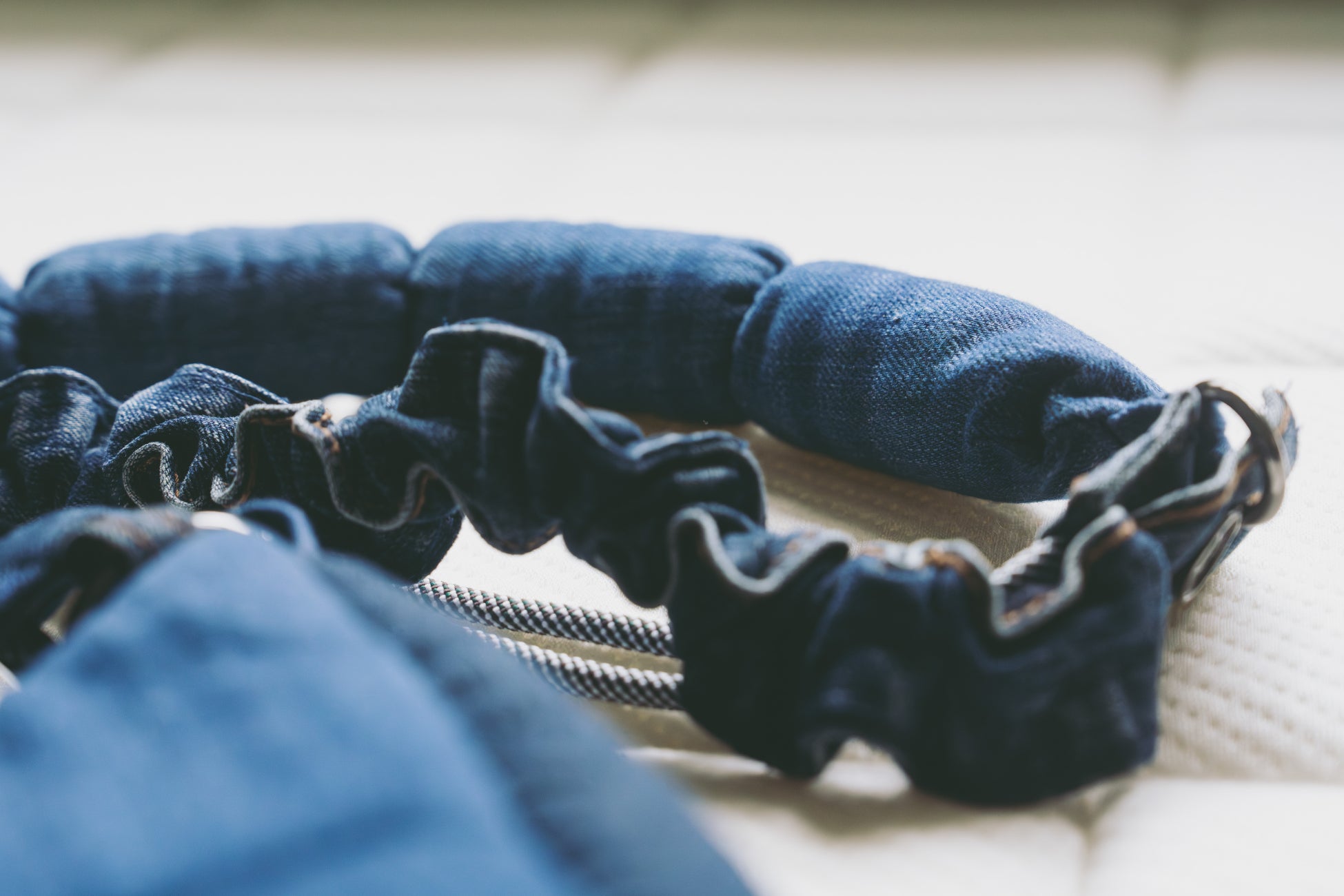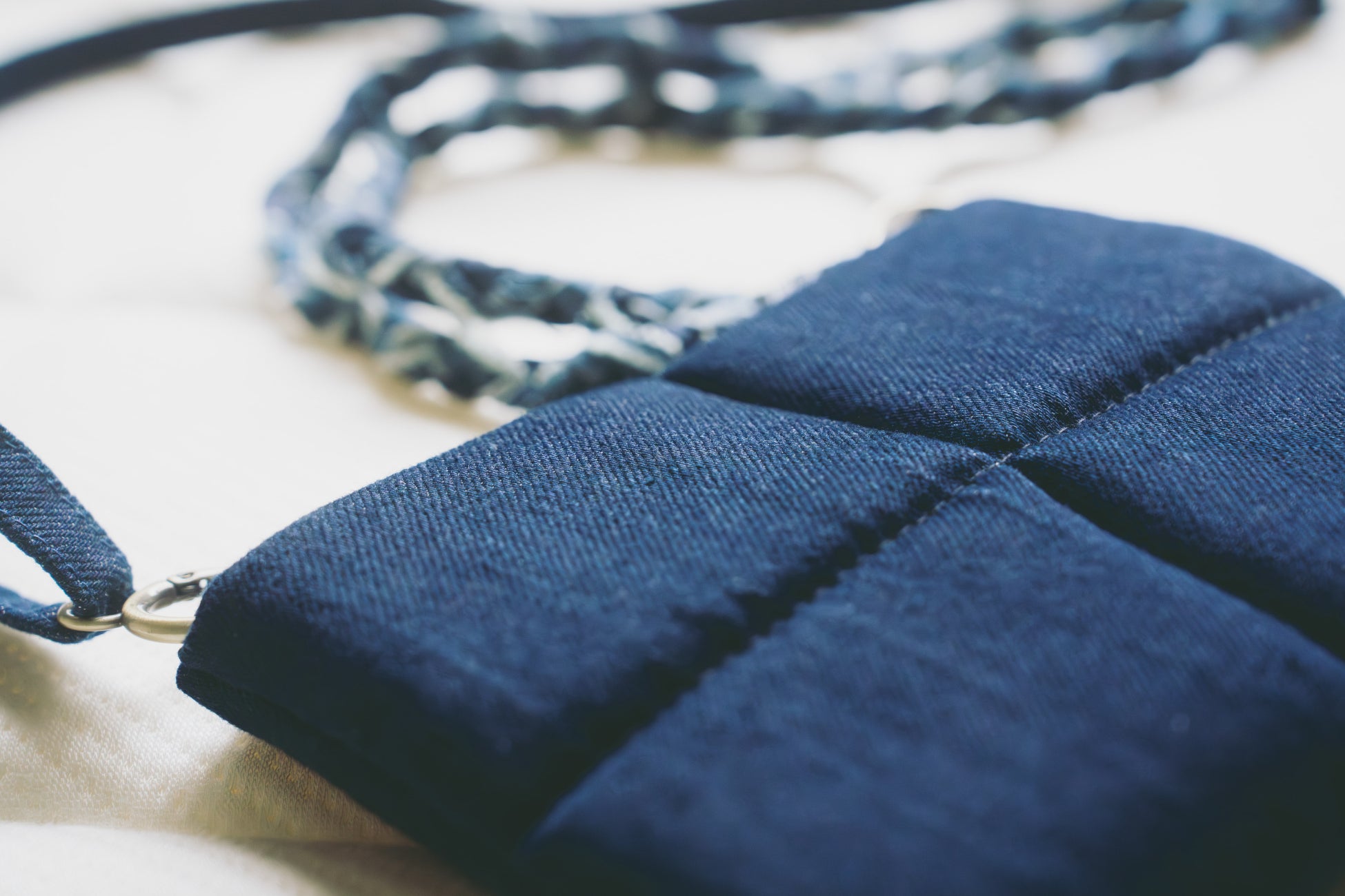 スリーピー・とうふマットレスの格子状デザインを着想源に、回収されたデニムをパッチワークで仕立て、柔らかさと適度なボリューム感を備えた手触りに仕上げました。マットレス端材のメモリーフォームによる格子状のクッション構造を、手編みでショルダーストラップに落とし込み、長さ調節が可能です。現代的なファッションアイテムに馴染み、スマートフォンやクレジットカードを収納可能。ストラップは取り外し可能で、単体ではスマホストラップとしても使用できます。