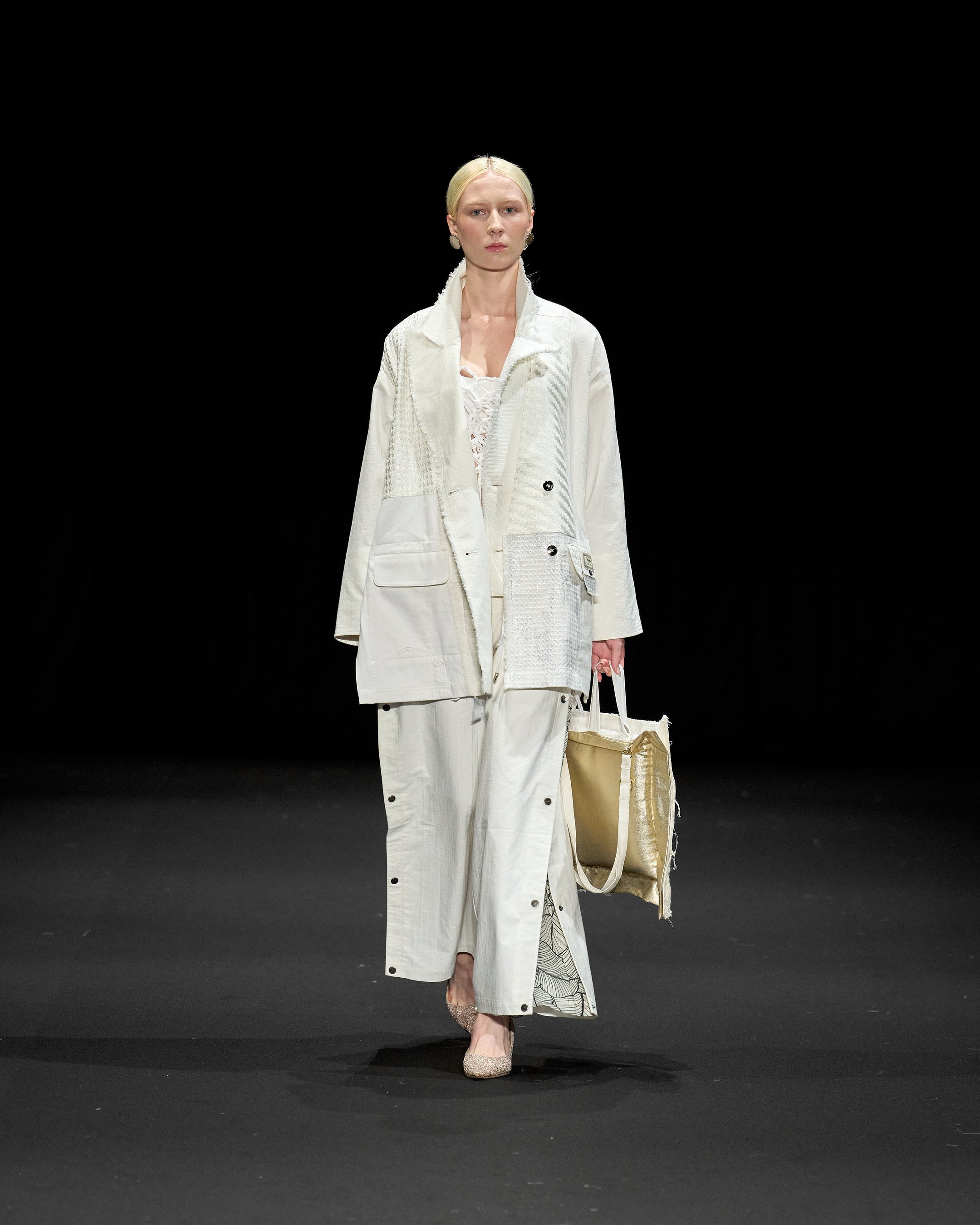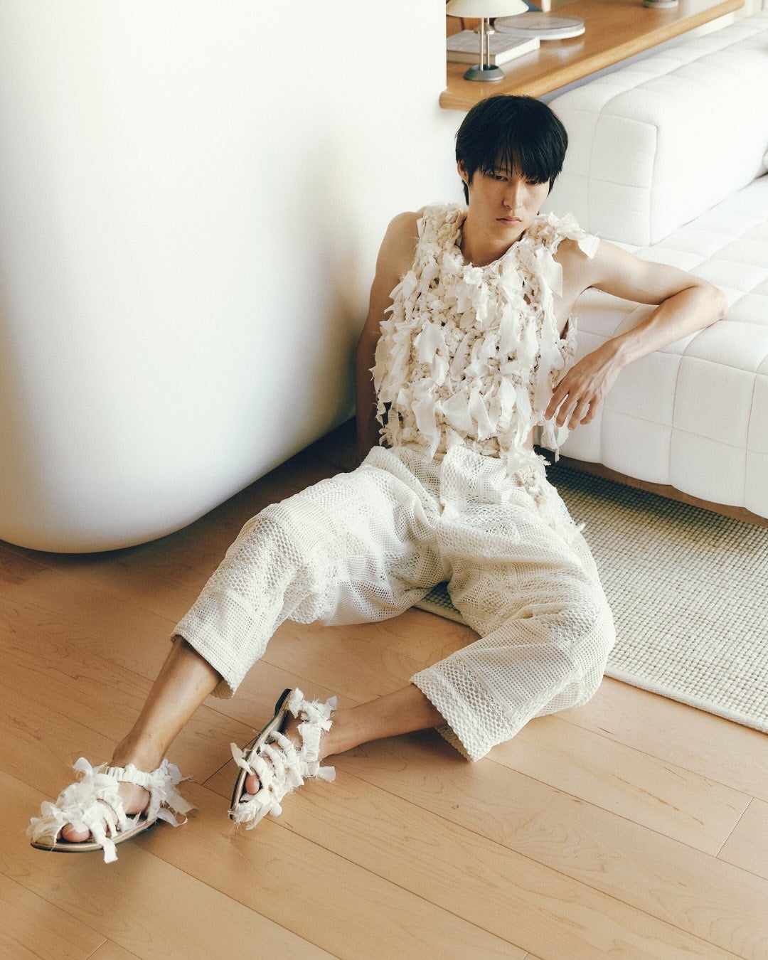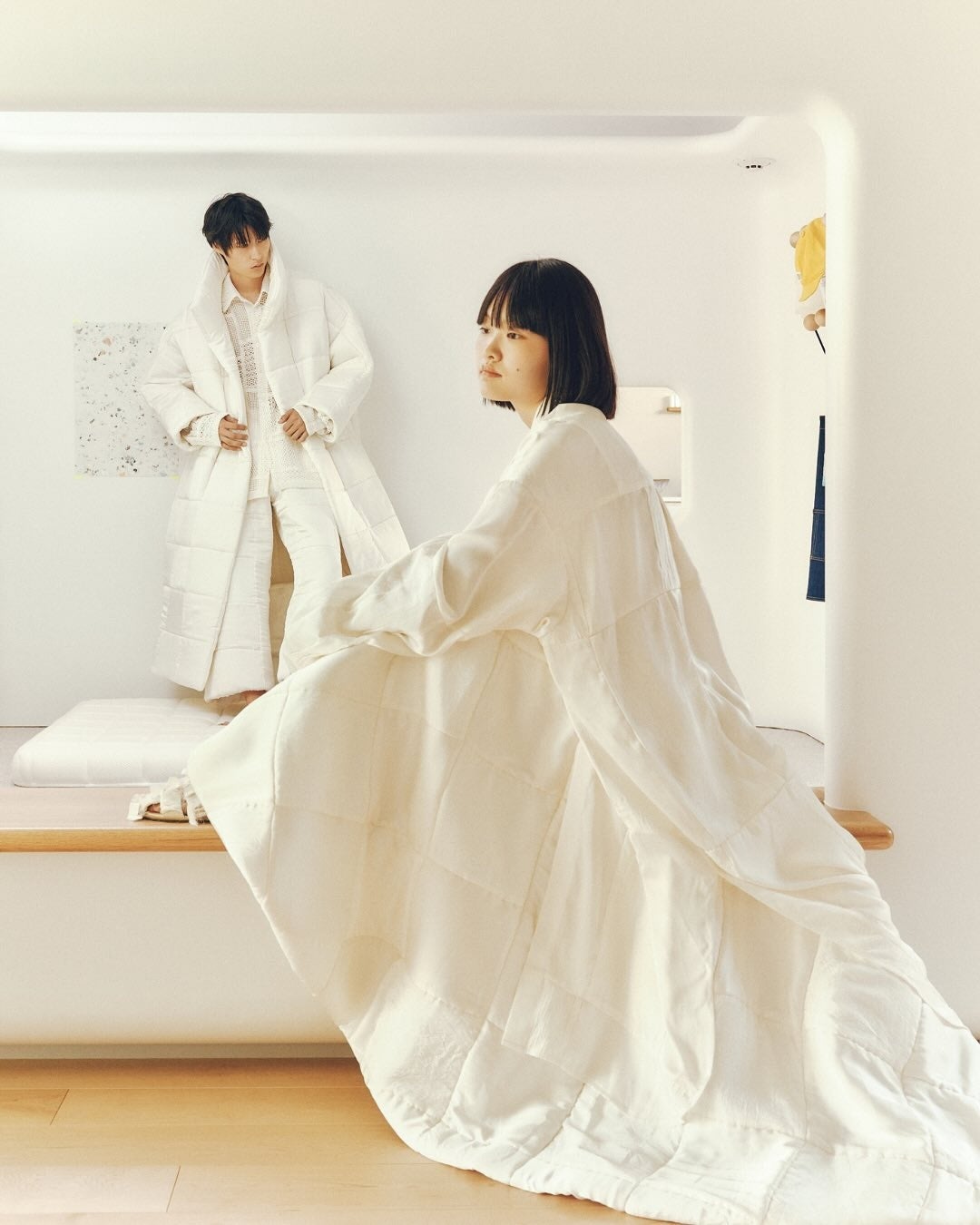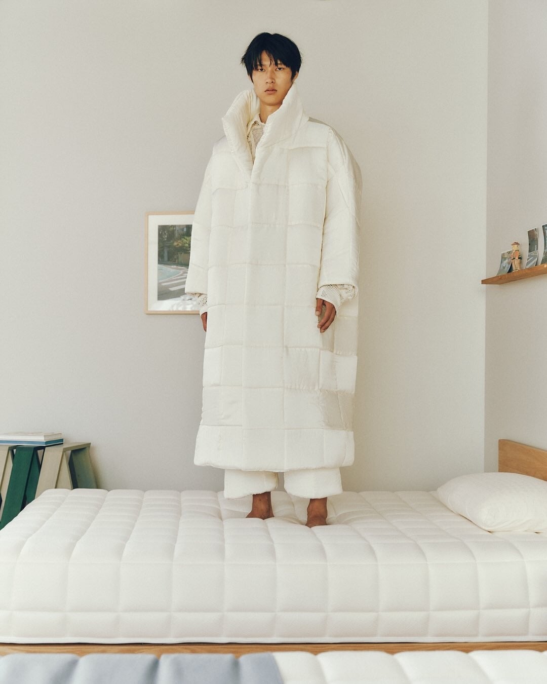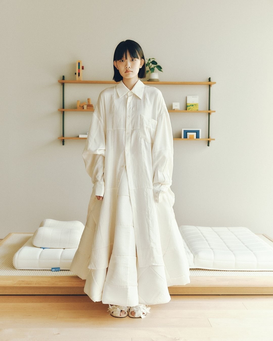 SLEEPY TOFUの象徴的な生地を使用し、TANG TSUNG CHIENブランドの象徴的な異素材パッチワークと融合。トーンはオフホワイトとアイボリーを基調とし、清らかで安心感のある雰囲気を演出しています。