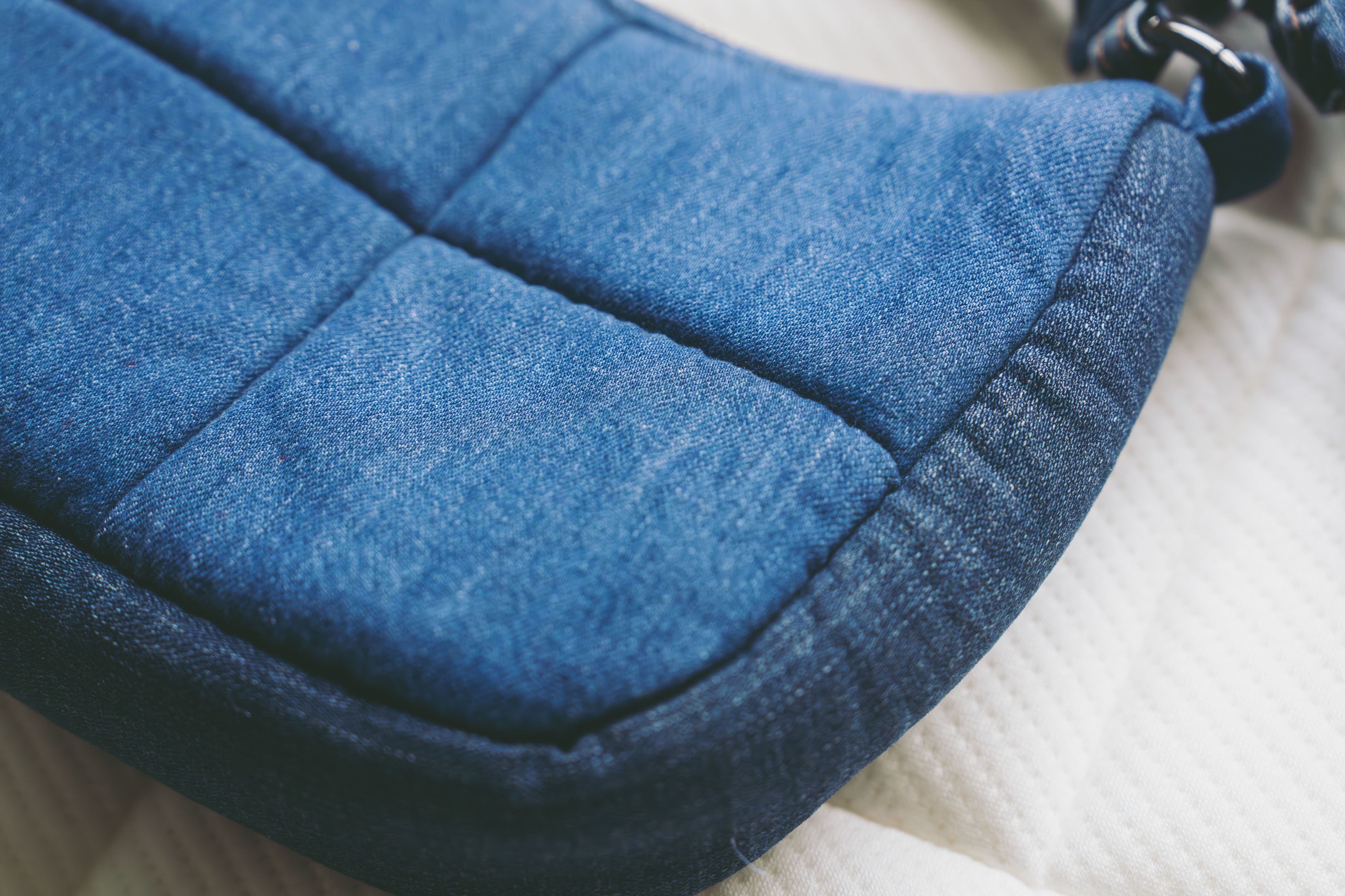 スリーピー・とうふマットレスの格子状デザインを着想源に、回収されたデニムをパッチワークで仕立て、柔らかさと適度なボリューム感を備えた手触りを実現。マットレス端材のメモリーフォームによる格子状のクッション構造がPCを保護し、機能性とファッション性を両立しています。Story Wear が掲げる「機能と環境の共生」という理念を形にしました。 全体はミニマルでありながら細部まで配慮され、都会の日常と自分らしいスタイルに寄り添う、現代的な佇まいに仕上げています。
