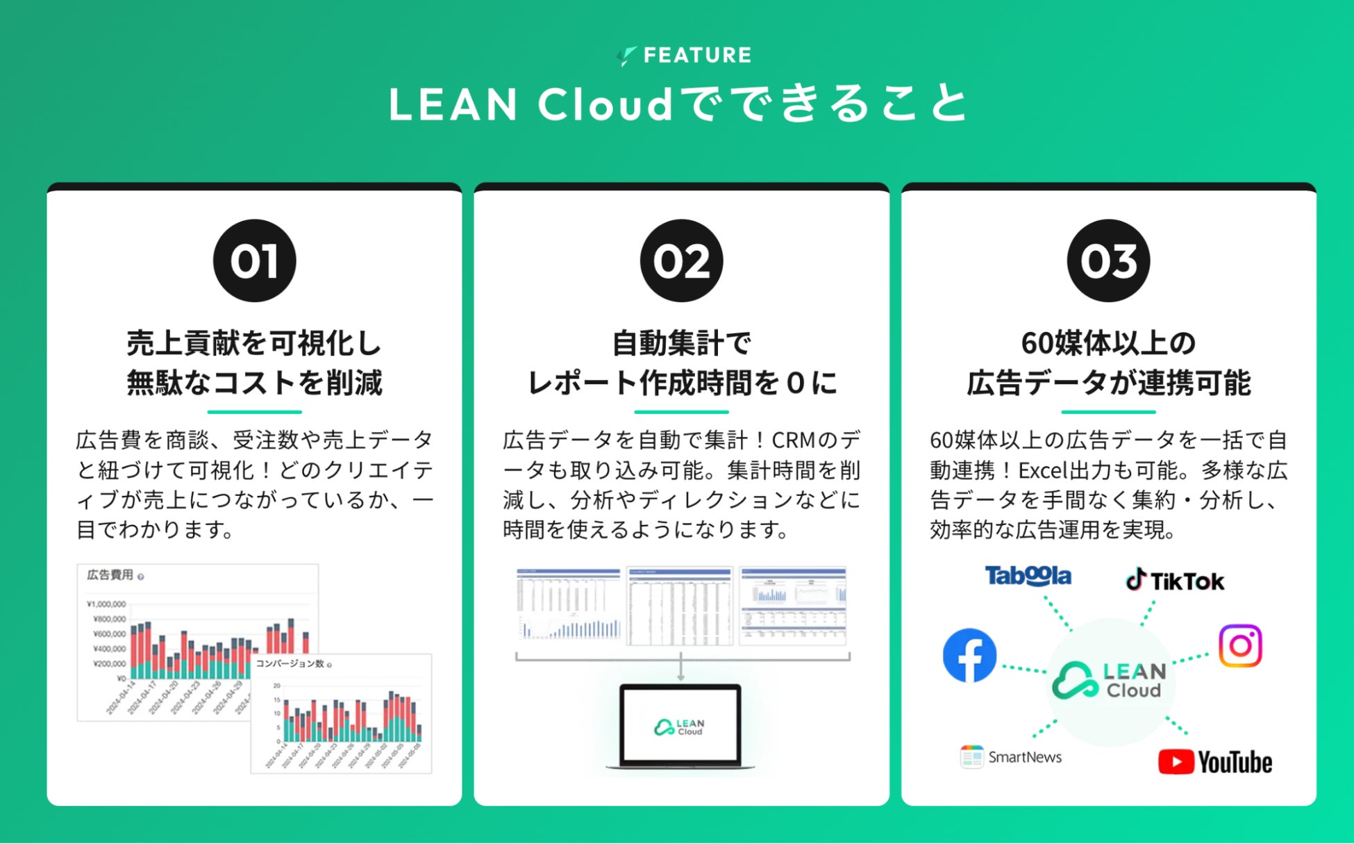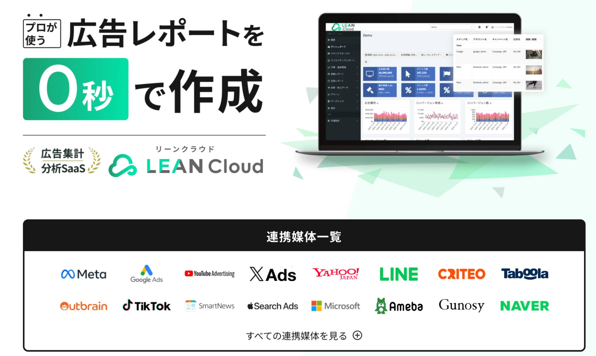 「リーンクラウド」は、複数媒体の広告データを一元管理し、国を跨いだ広告集計・分析・レポートを自動化するSaaSです。