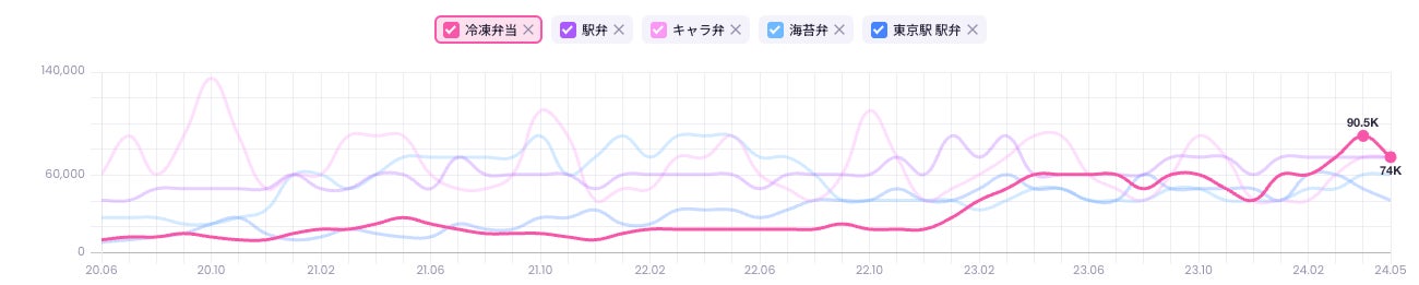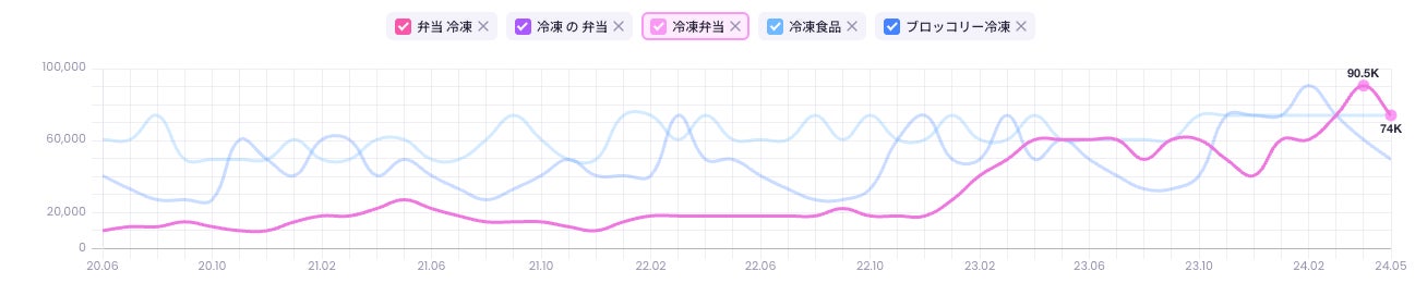 2つの市場で冷凍弁当の検索ボリュームが2024年の4月にかけて増加していることが分かります。