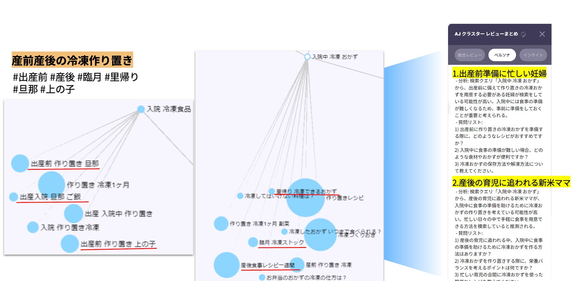 先ほどのパスファインダーで取り上げた「調理して冷凍保存したい」というグループの中に、産前産後の母のニーズがあることが表れています。