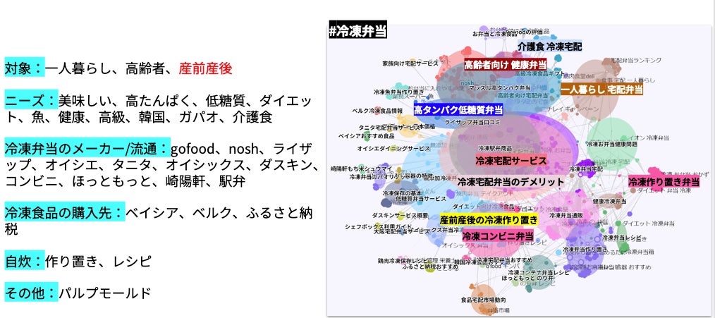 ニーズには、「高タンパク」「低糖質」「ダイエット」「健康」というキーワードがありました。美味しくて、健康になれる冷凍弁当を求めているようです。