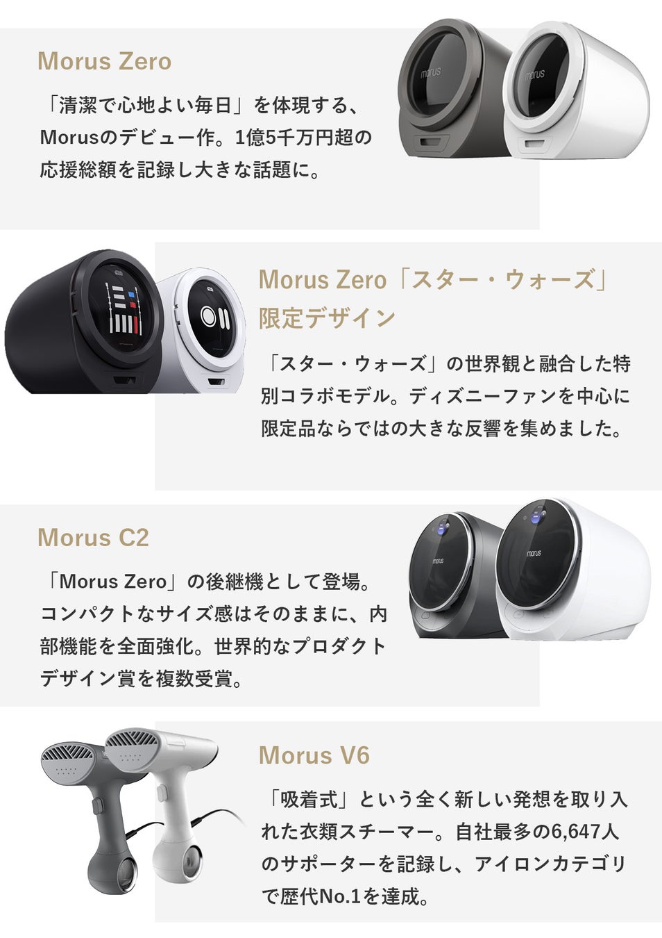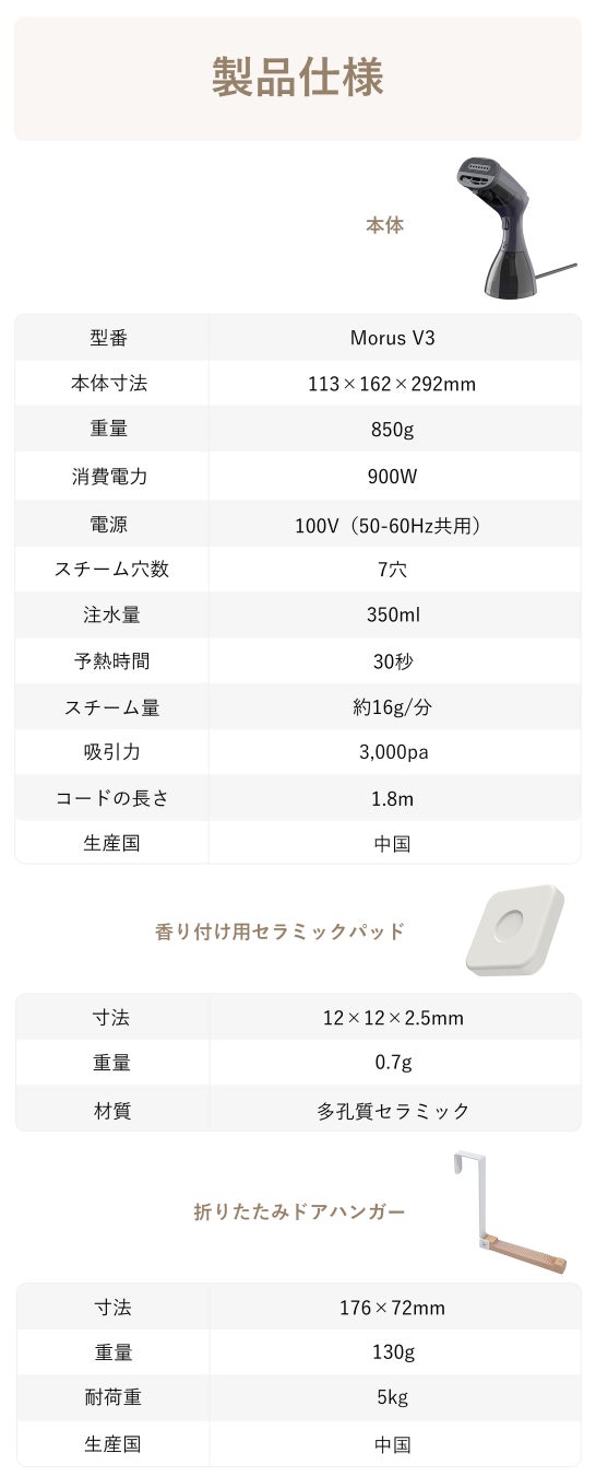 前作「Morus V6」の発売後、多くのお客様から喜びの声をいただく一方で、「吸着力がもっとほしい」「自立しないのが不便」「シワ伸ばしと同時に香り付けもできたら」といった新たな要望も寄せられました。こうした声に真摯に応え、さらなる進化を遂げたのが「Morus V3」です。