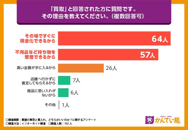 全体として、「現金化のスピード」と「不用品の整理」が、買取を選ぶ大きな理由となっていることがわかります。