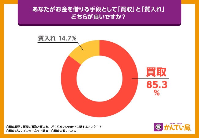 質屋でお金を借りる手段として「買取」を希望している方が85.3%