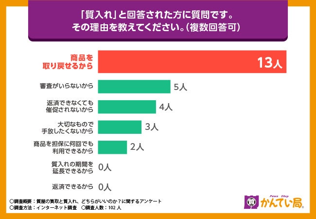 次に「『質入れ』と回答された方に質問です。その理由を教えてください。(複数回答可)」と質問したところ、最も多かった回答は「商品を取り戻せるから」で、13人がこの理由を選びました。質入れならではのメリットである、大切な品物を手放す必要がないまま、一時的に資金を調達できる点が支持されていると考えられます。