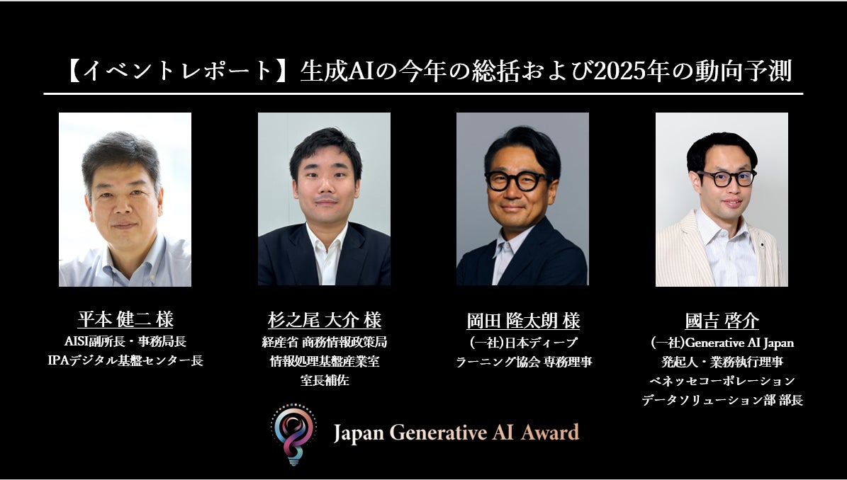 一般社団法人Generative AI Japan(所在地:東京都多摩市、代表理事:宮田 裕章、以下「GenAI〈読み:ジェナイ〉」)と、日経BP(本社:東京都港区、社長CEO:井口 哲也)が発行・運営する経済メディア「日経ビジネス」が共同で開催した「生成AI大賞2024」では、業界の専門家や研究者が一堂に会し、生成AIの最新動向や未来の可能性について熱い議論を交わすパネルトークが行われました。「日本における生成AIの現在地と2025年の展望」をテーマに、登壇者たちはそれぞれの視点から示唆に富んだトークが繰り広げられ、参加者にとって貴重な知見を提供する場となりました。本レポートでは、当日の模様を詳しくお伝えします。