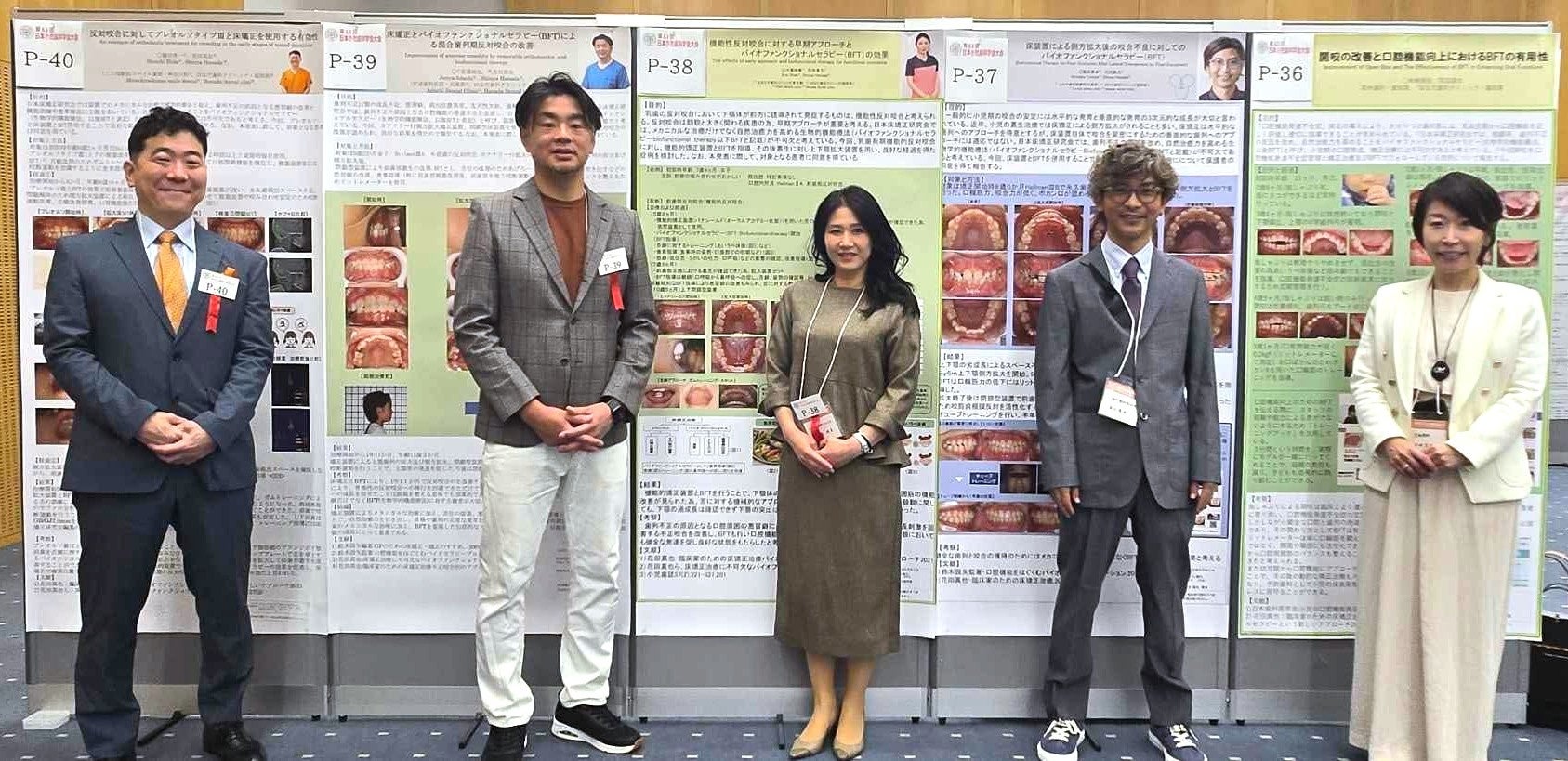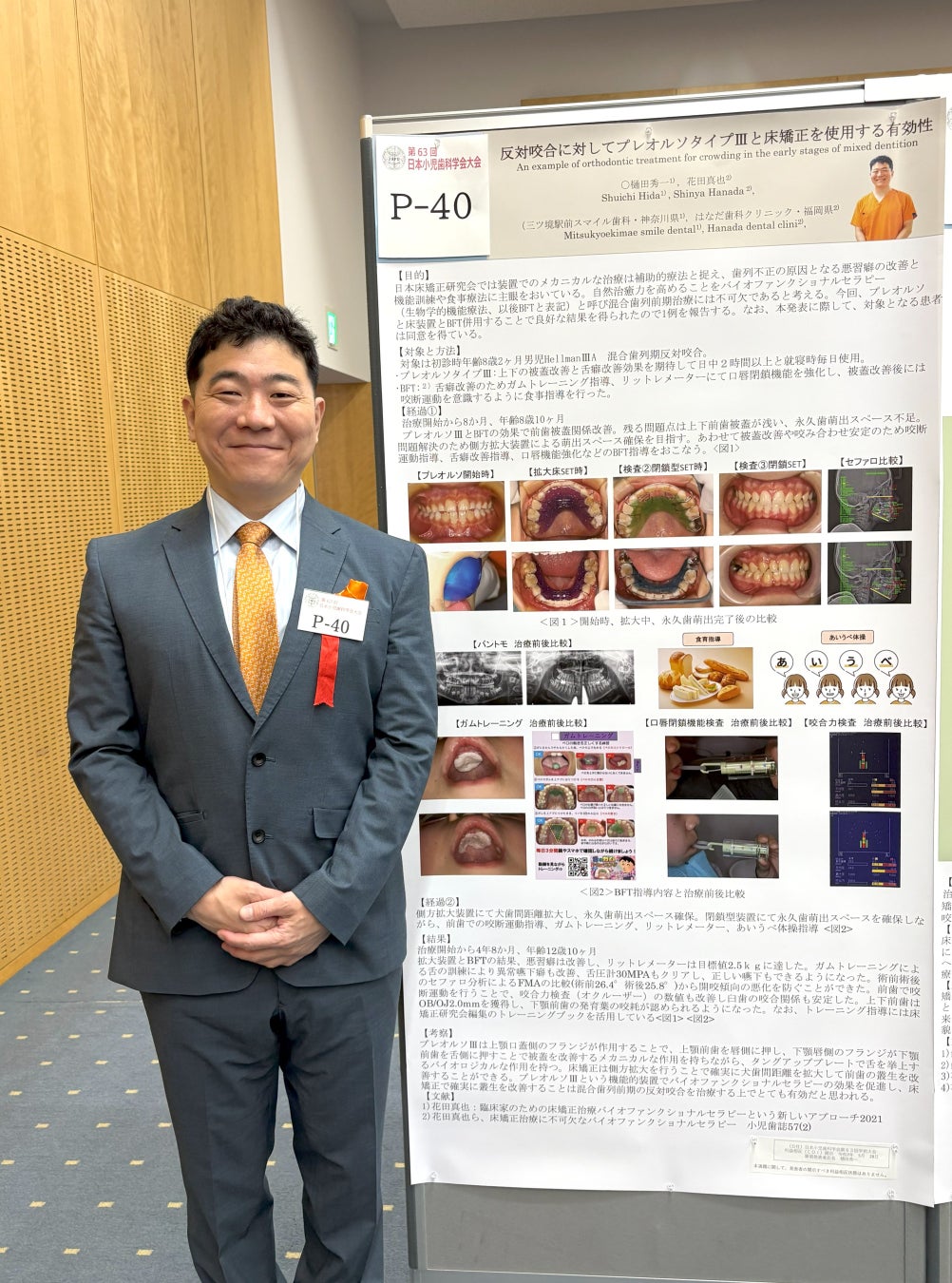 当院院長 樋田秀一も「反対咬合に対してプレオルソタイプⅢと床矯正を使用する有効性」に関するポスター発表を行いました。全国から参加した小児歯科医・矯正歯科医・大学研究者らと活発な意見交換が行われ、症例に対するアプローチの違いや地域特性をふまえた指導法など、今後の臨床現場での応用につながる多くの学びを得ました。