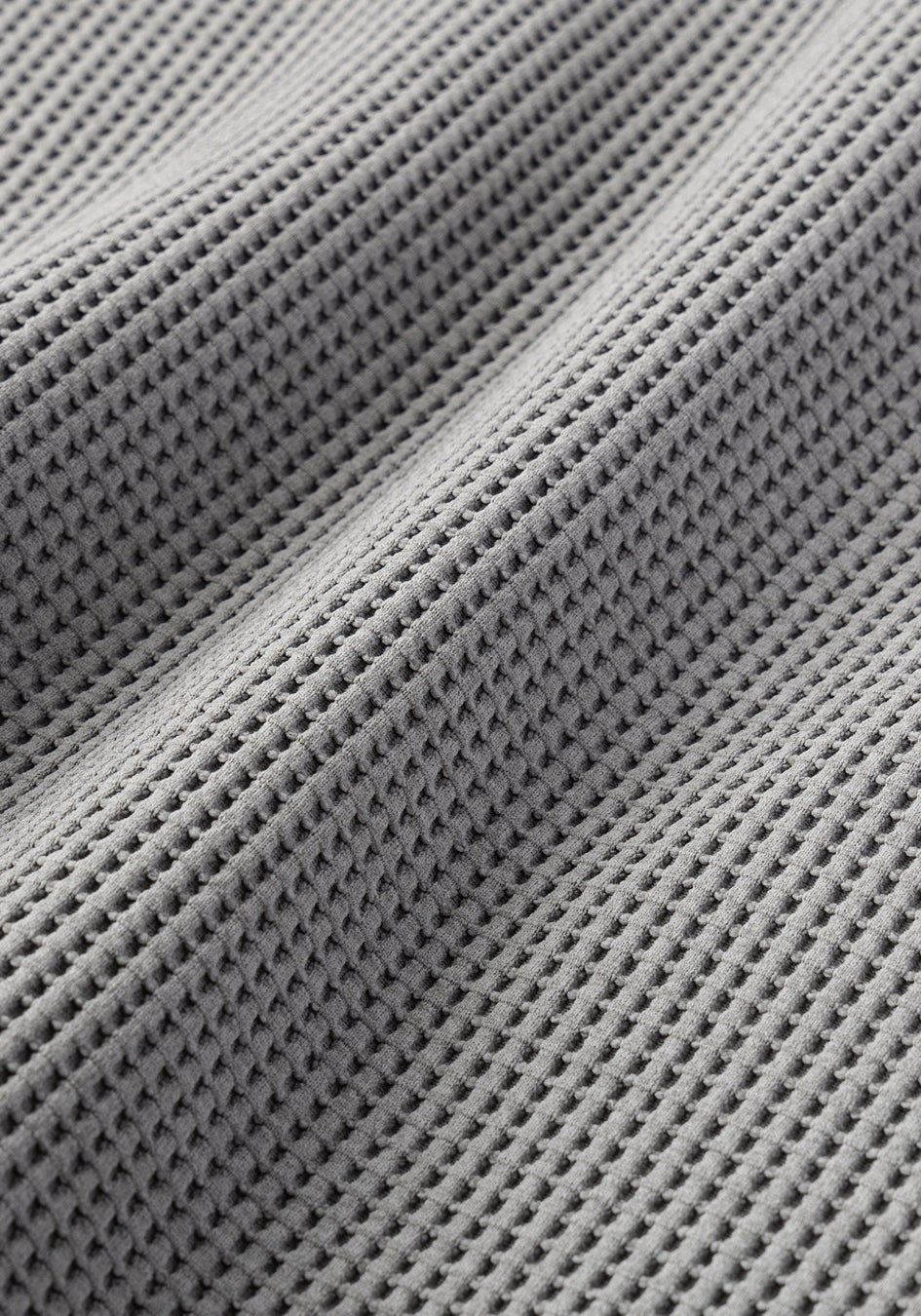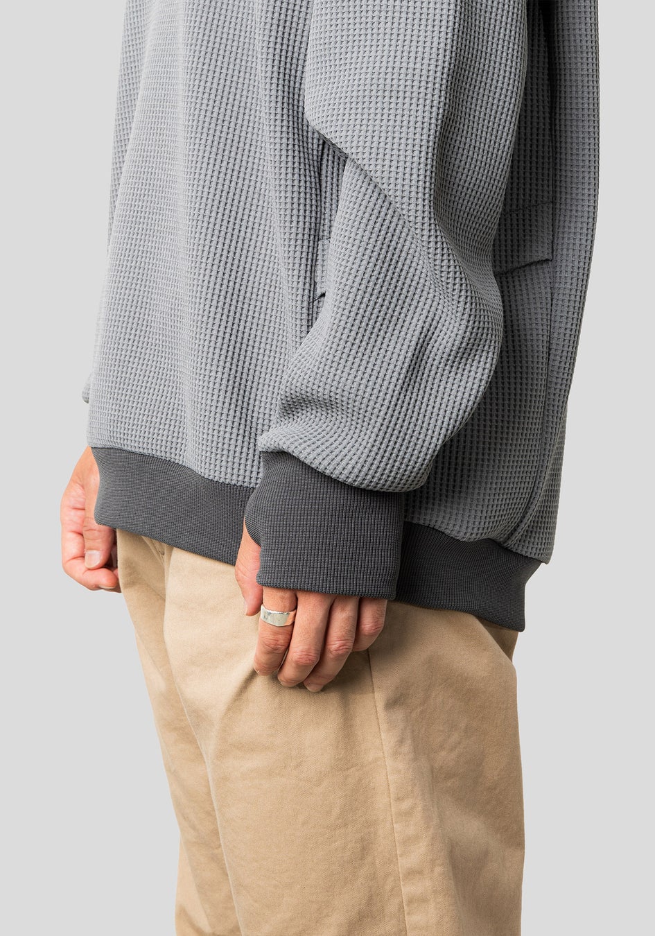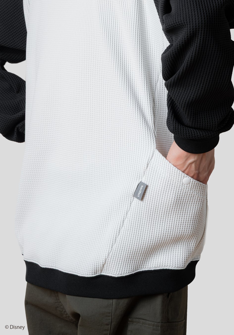 帝人フロンティアが開発したSOLOTEX® と DELTAPEAK® の2種類の糸を組み合わせることで、上品なハリコシがある程よいボリュームと、心地よい伸縮性を備えています。吸汗速乾性・UVカット・形態安定性も備えた高機能生地。クルーネックスウェットに採用。