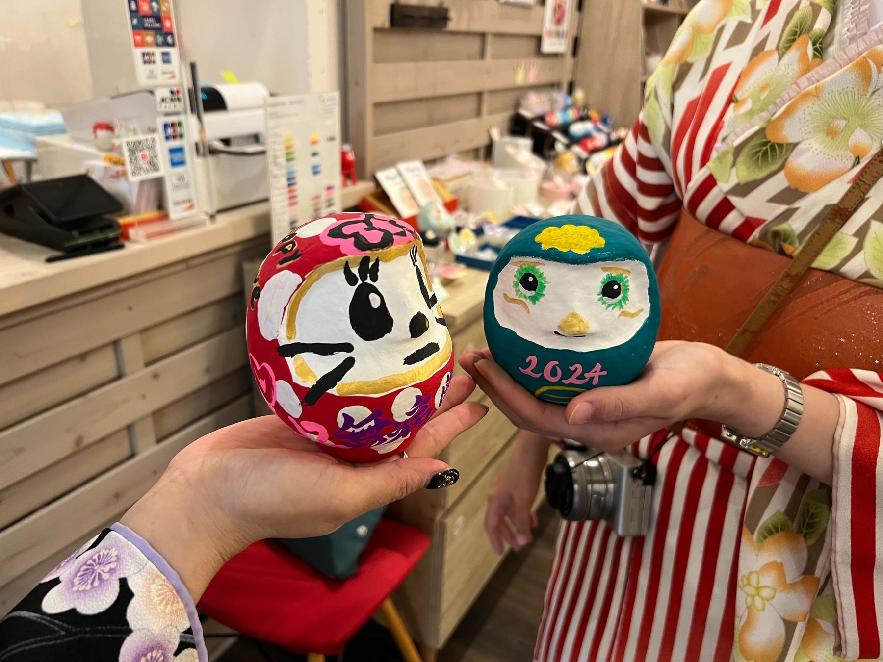 「ペイントコース」は、真っ新なだるま型に、塗装から始める本格派。価格の幅は9cm/12cm/16cmという「ペイントして持ち帰りたいだるまのサイズ」によるもので、速乾性の高い塗料を使用するため、「デコレーションコース」同様に自分が作ったオリジナルのだるまを当日持ち帰ることができるのが嬉しいポイント。もちろん、筆での文字入れもお願いできる。